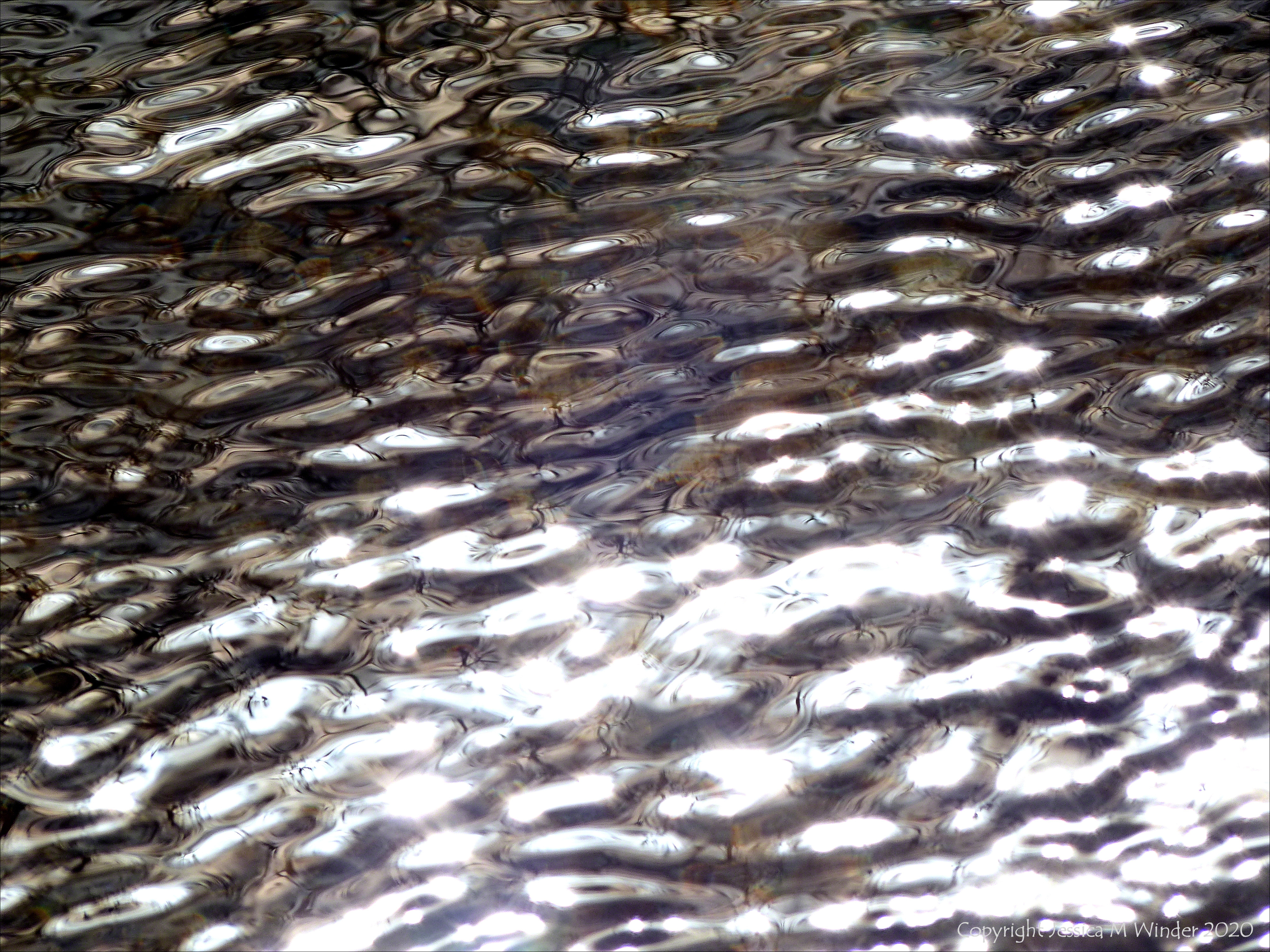 Abstract natural patterns of reflected light on a rippled water surface in a shallow flowing chalk river near Charlton Down in Dorset.