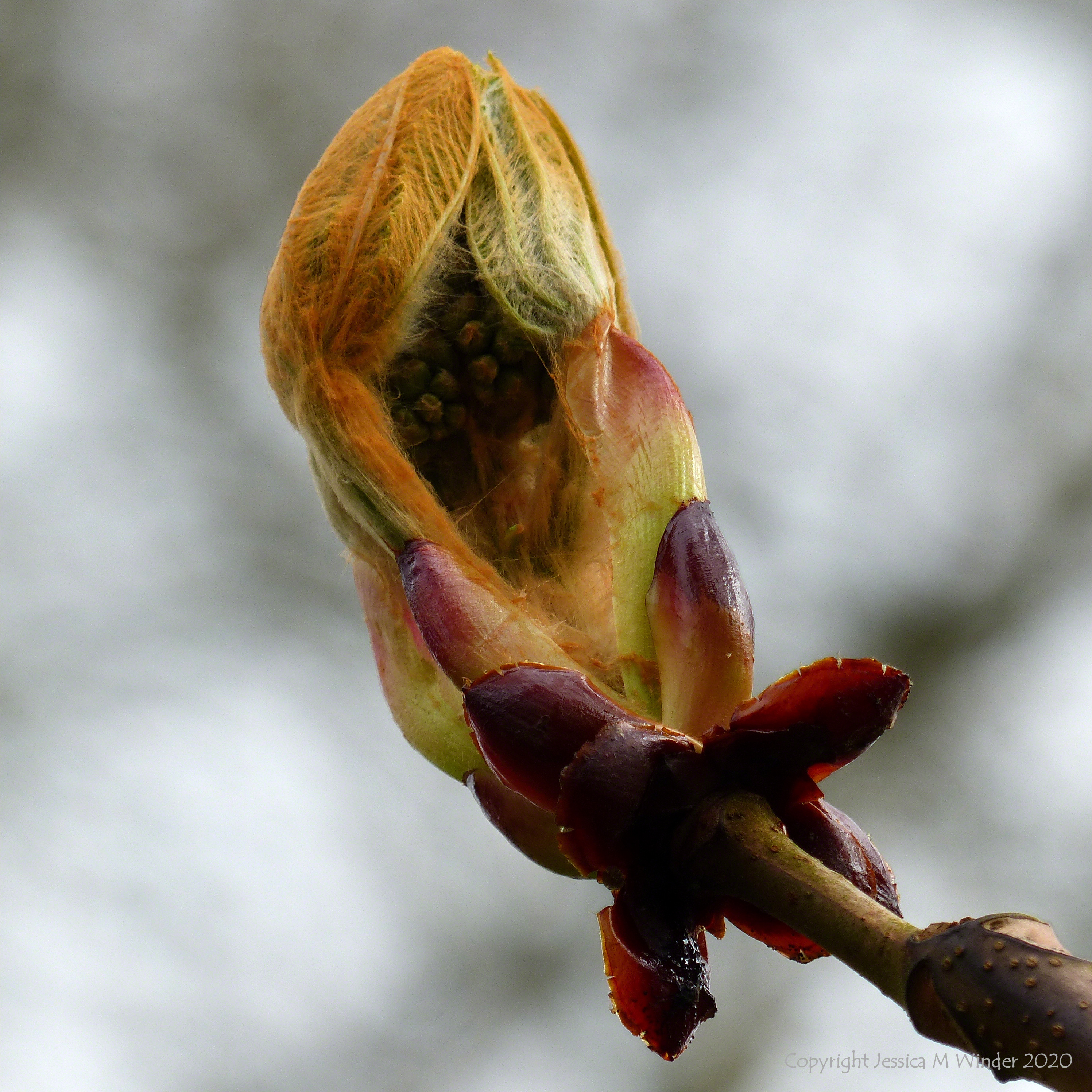 The sticky buds of the horse chestnut trees are opening further to reveal the crinkly new leaves and the tight flower buds within. Charlton Down April 2020.