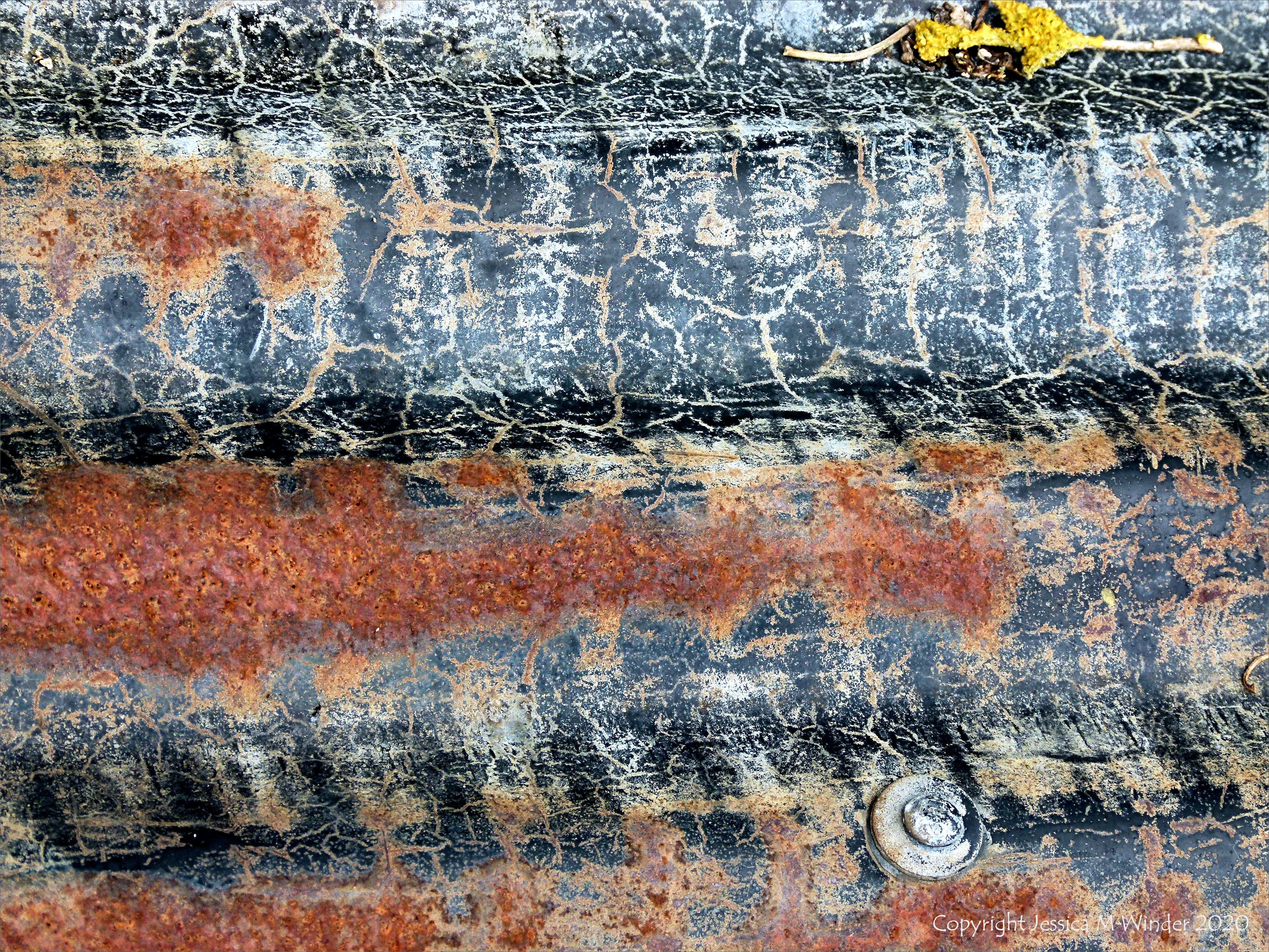 Patterns of rust and cracked black paint on weathered corrugated iron sheeting from the collapsed roof of a farm building