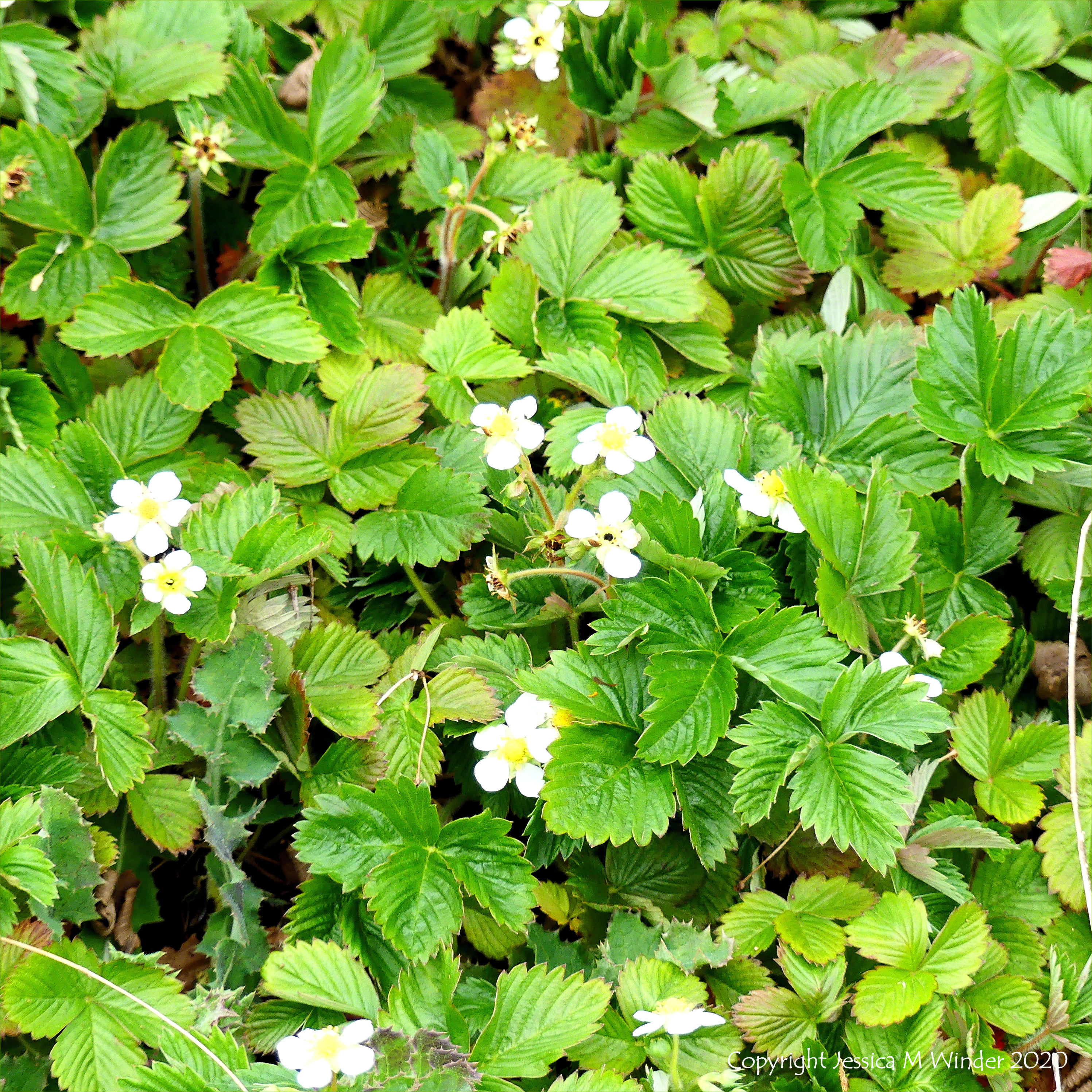 Wild strawberry plants blooming in Charlton Down this spring, 2020.