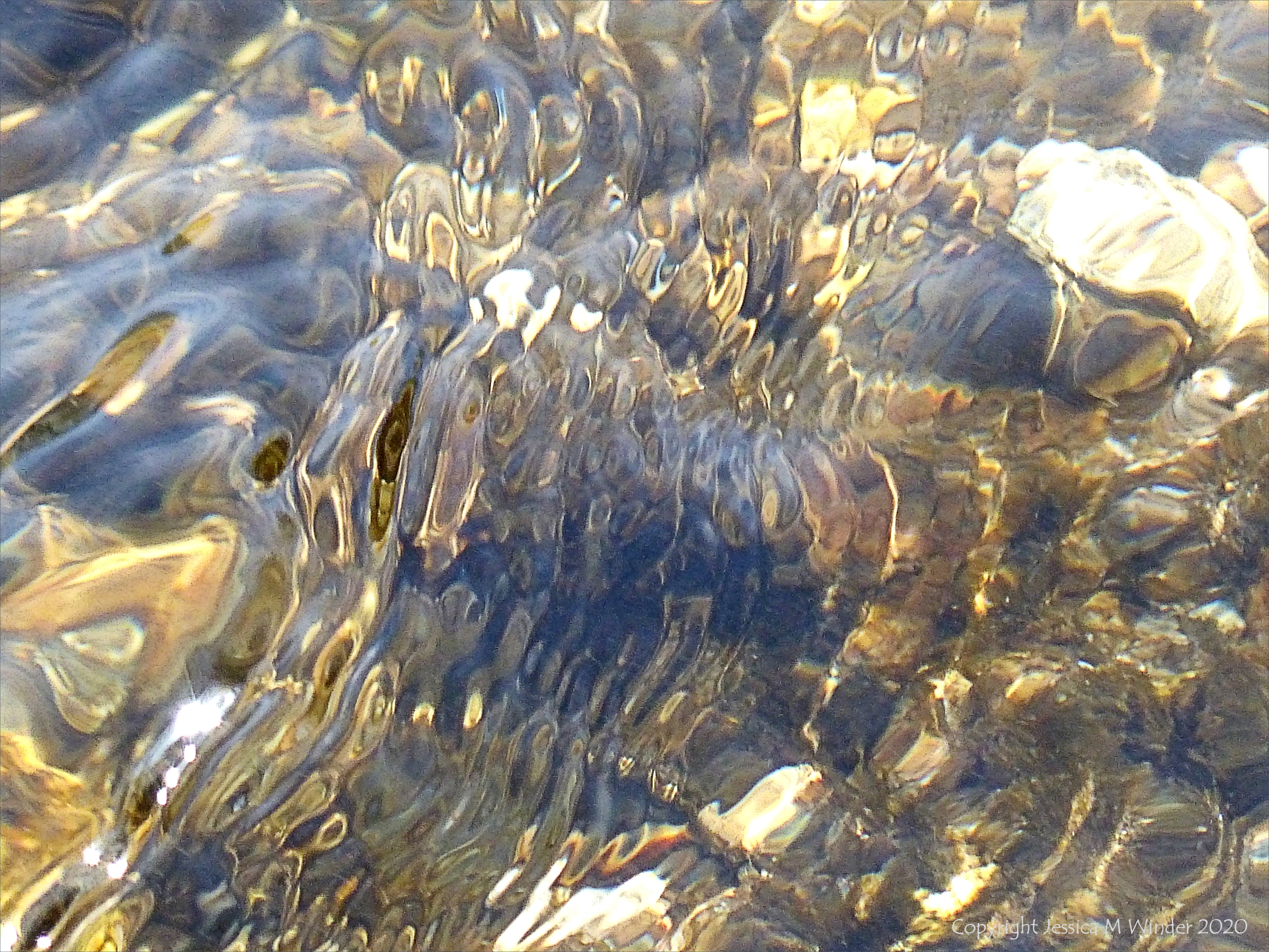Abstract natural patterns of reflected light on shallow rippled water flowing over the stony bed of a chalk river near Charlton Down in Dorset.