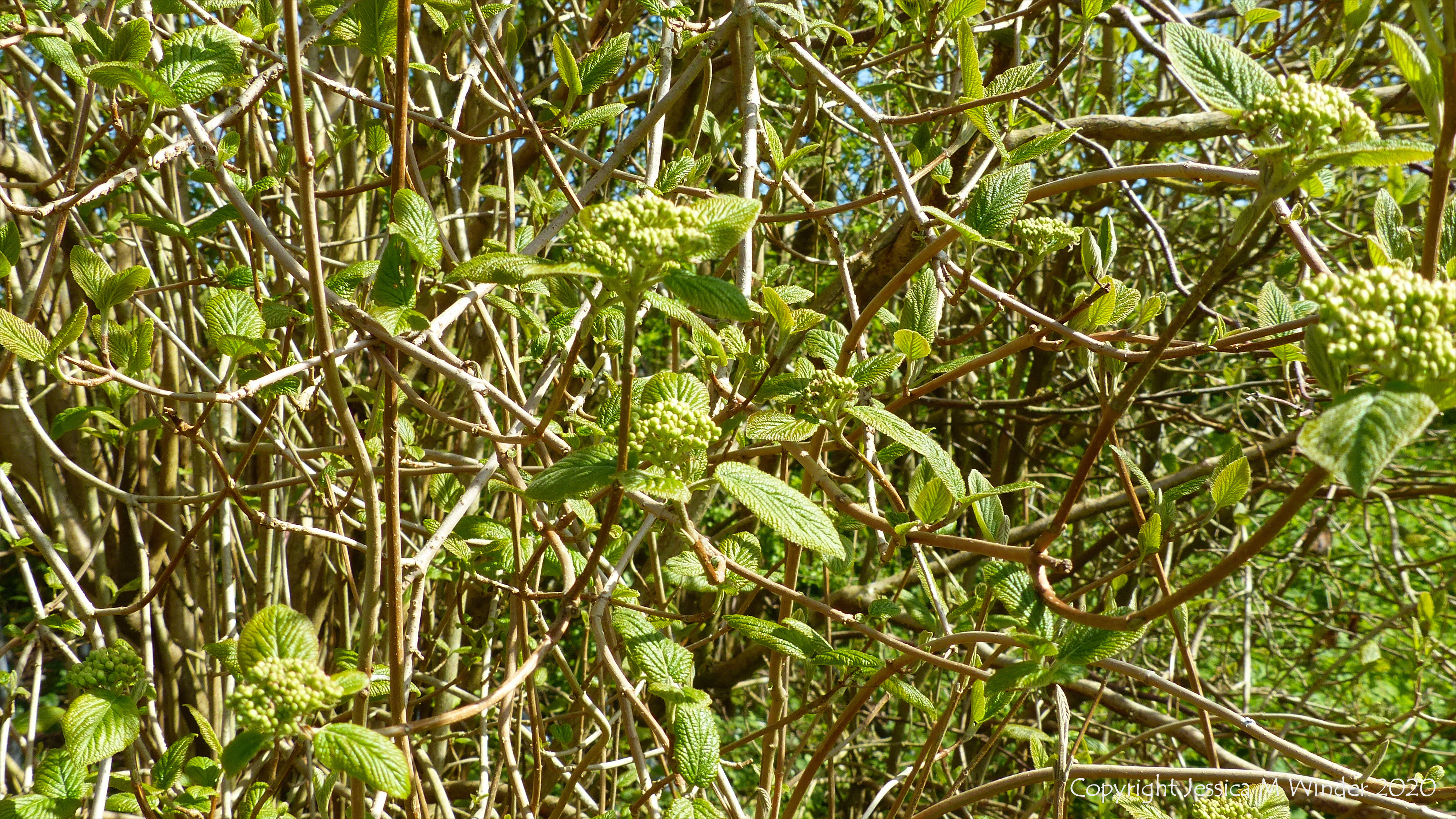 Leaves and buds of the Wayfaring Tree opening in springtime in the local nature resrve in the Dorset village of Charlton Down. Photographed during the short daily walk permitted during the coronavirus lockdown, 2020.