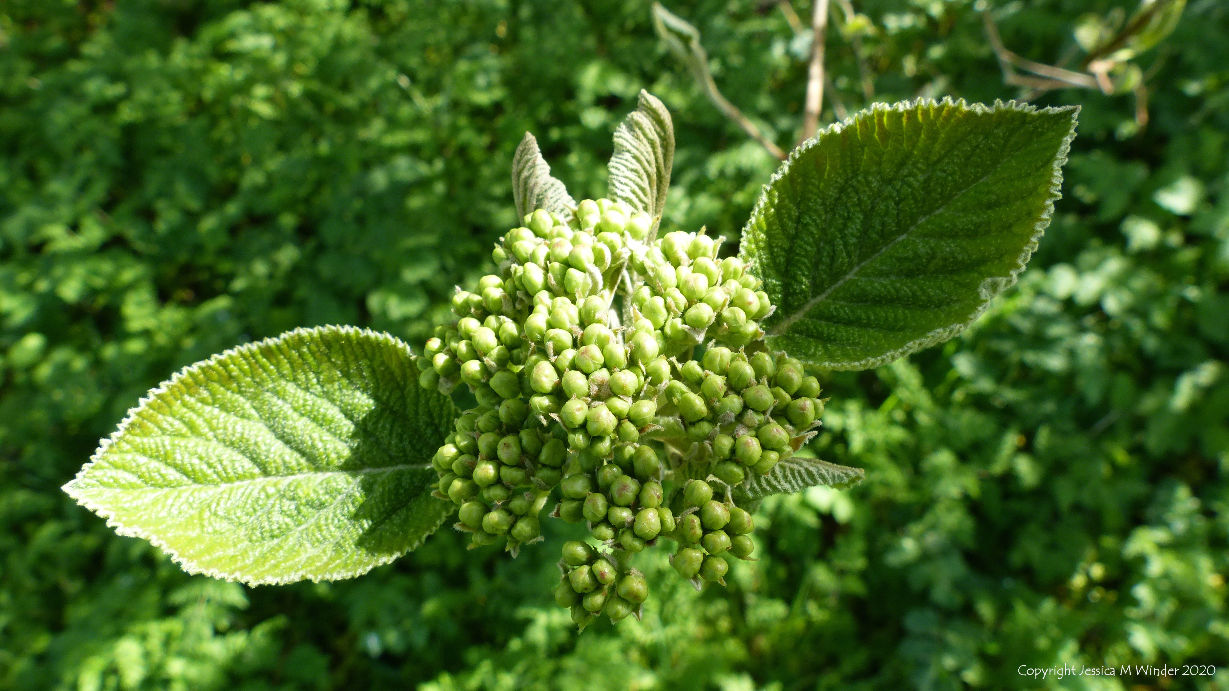 Leaves and buds of the Wayfaring Tree opening in springtime in the local nature resrve in the Dorset village of Charlton Down. Photographed during the short daily walk permitted during the coronavirus lockdown, 2020.
