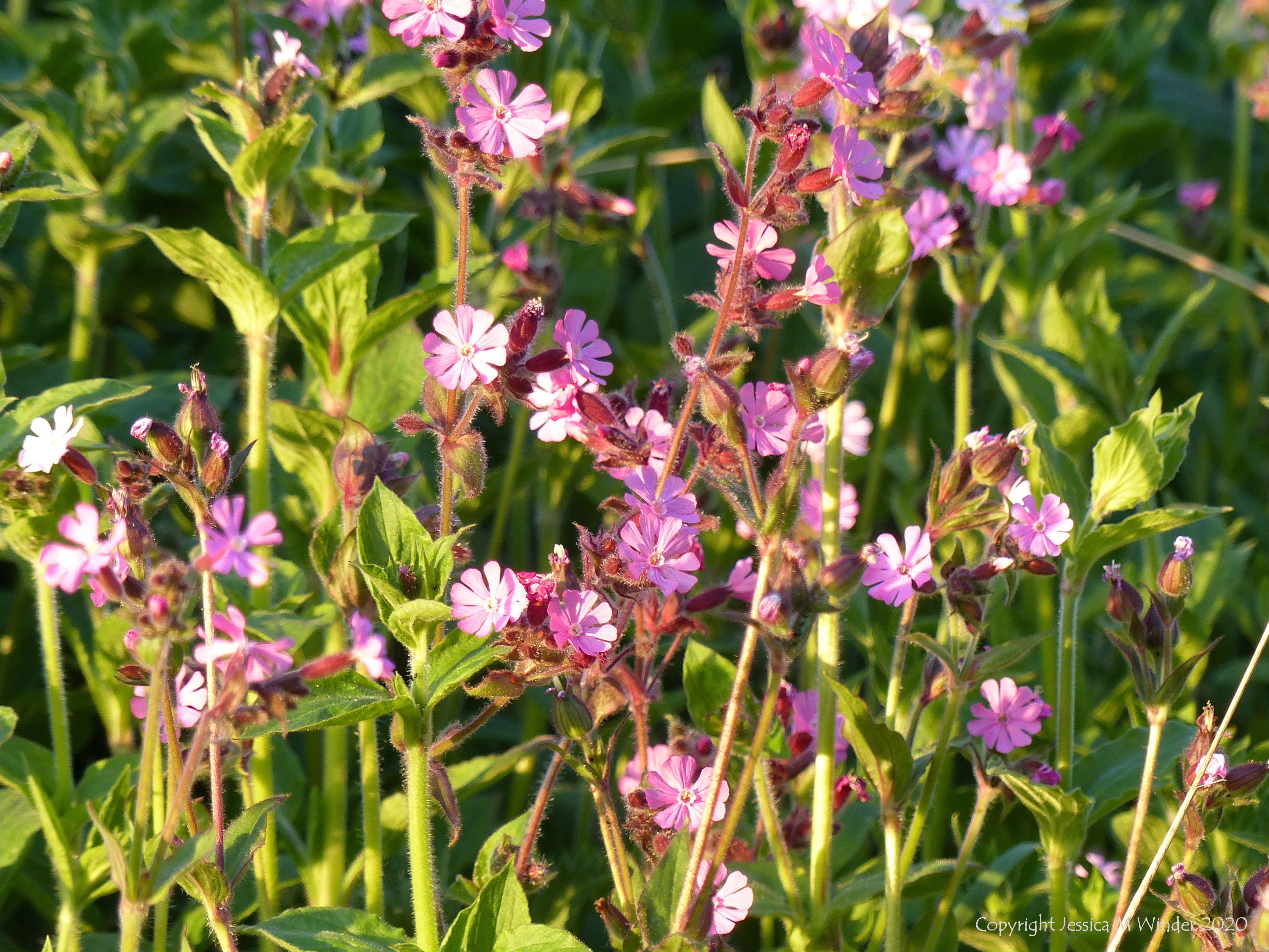 Flowers of Red Campion (Silene dioica) glowing in the last of the evening sun at Charlton Down in Dorset during the short walk permitted for exercise during the coronavirus lockdown, April 2020