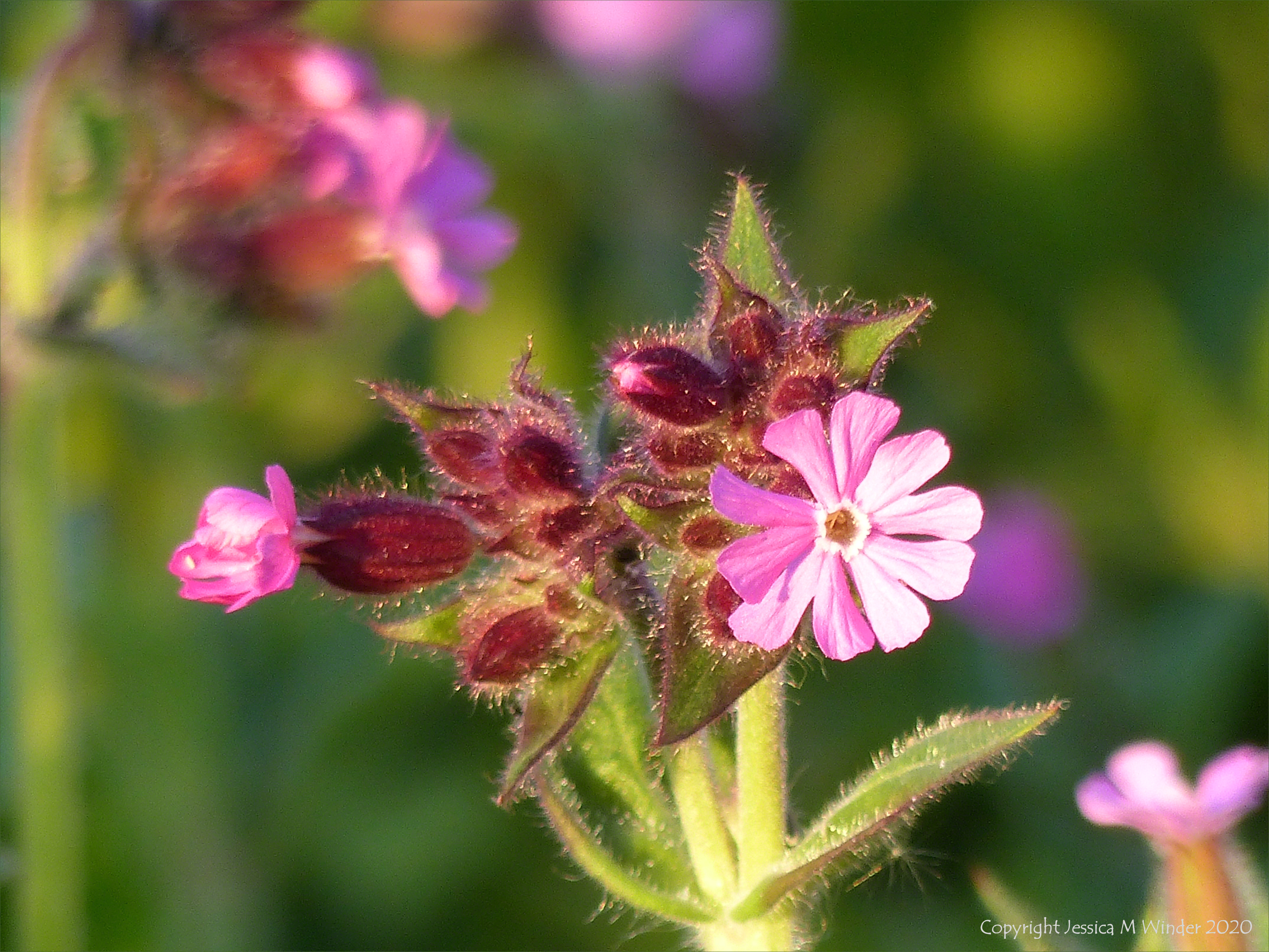 Flowers of Red Campion (Silene dioica) glowing in the last of the evening sun at Charlton Down in Dorset during the short walk permitted for exercise during the coronavirus lockdown, April 2020