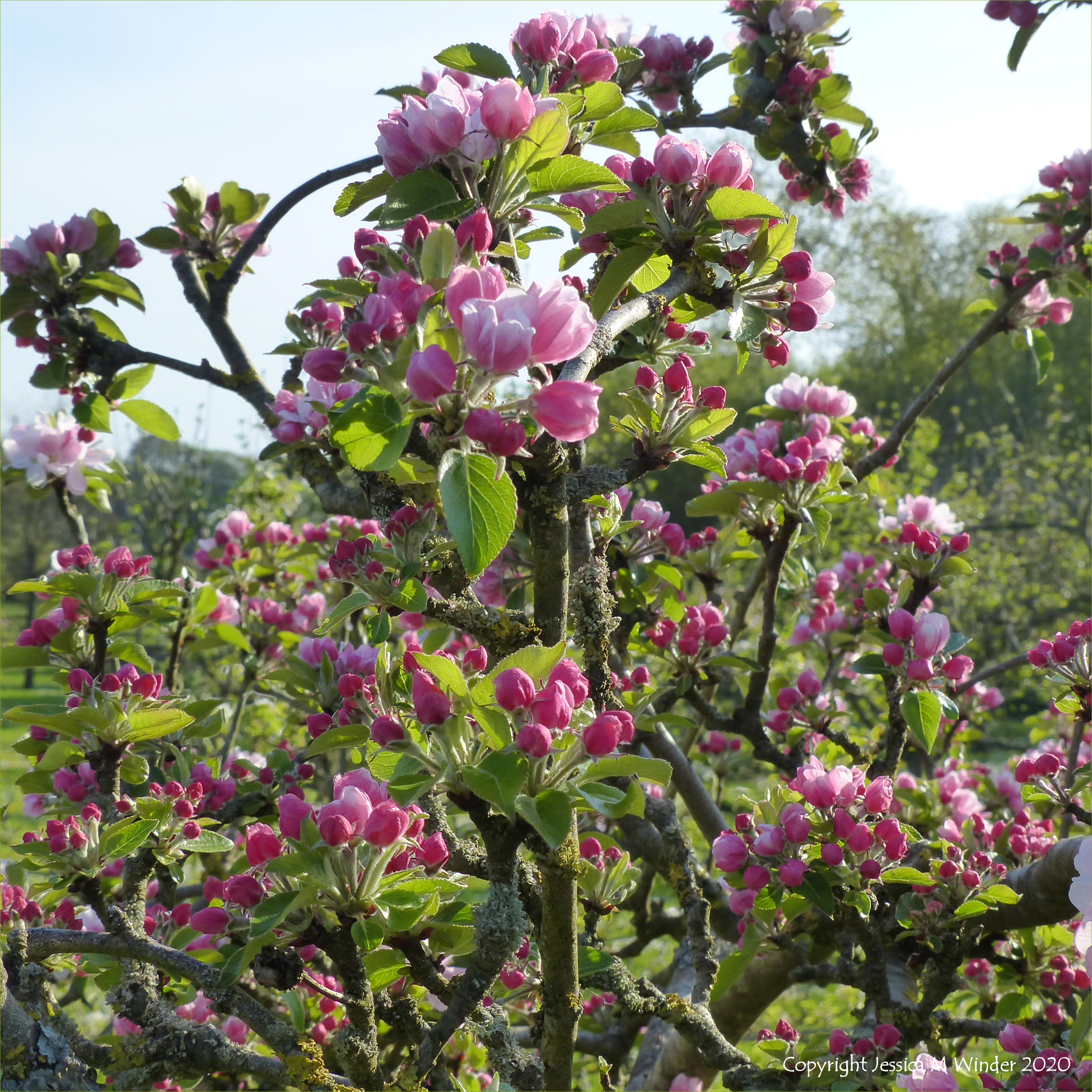 Apple blossoms in the community orchard at Charlton Down in Dorset, photographed during the permitted daily walk of the coronavirus lockdown, April 2020