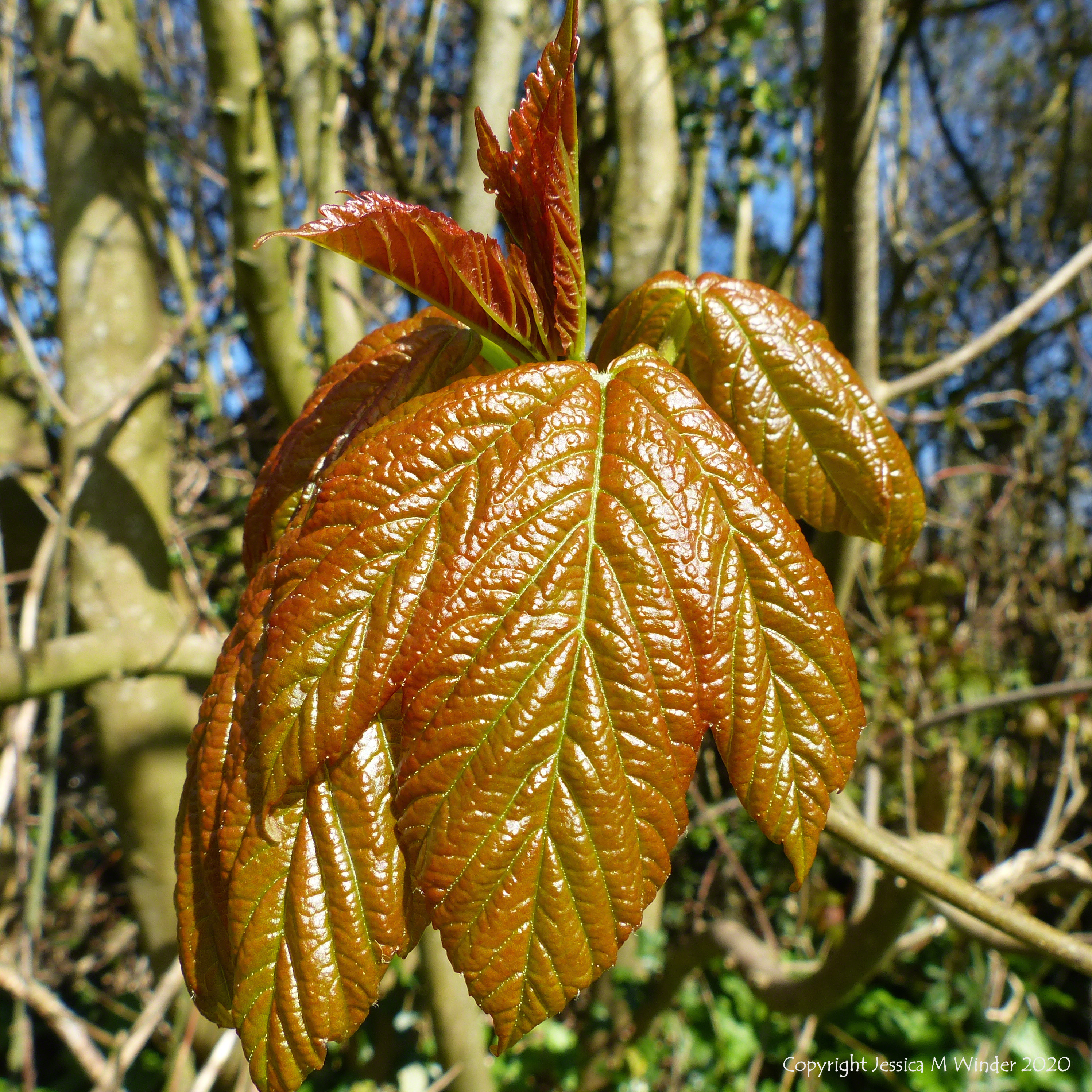 New leaves on a Sycamore tree at Charlton Down in Dorset, photographed on the daily walk permitted during the coronavirus lockdown, Spring 2020