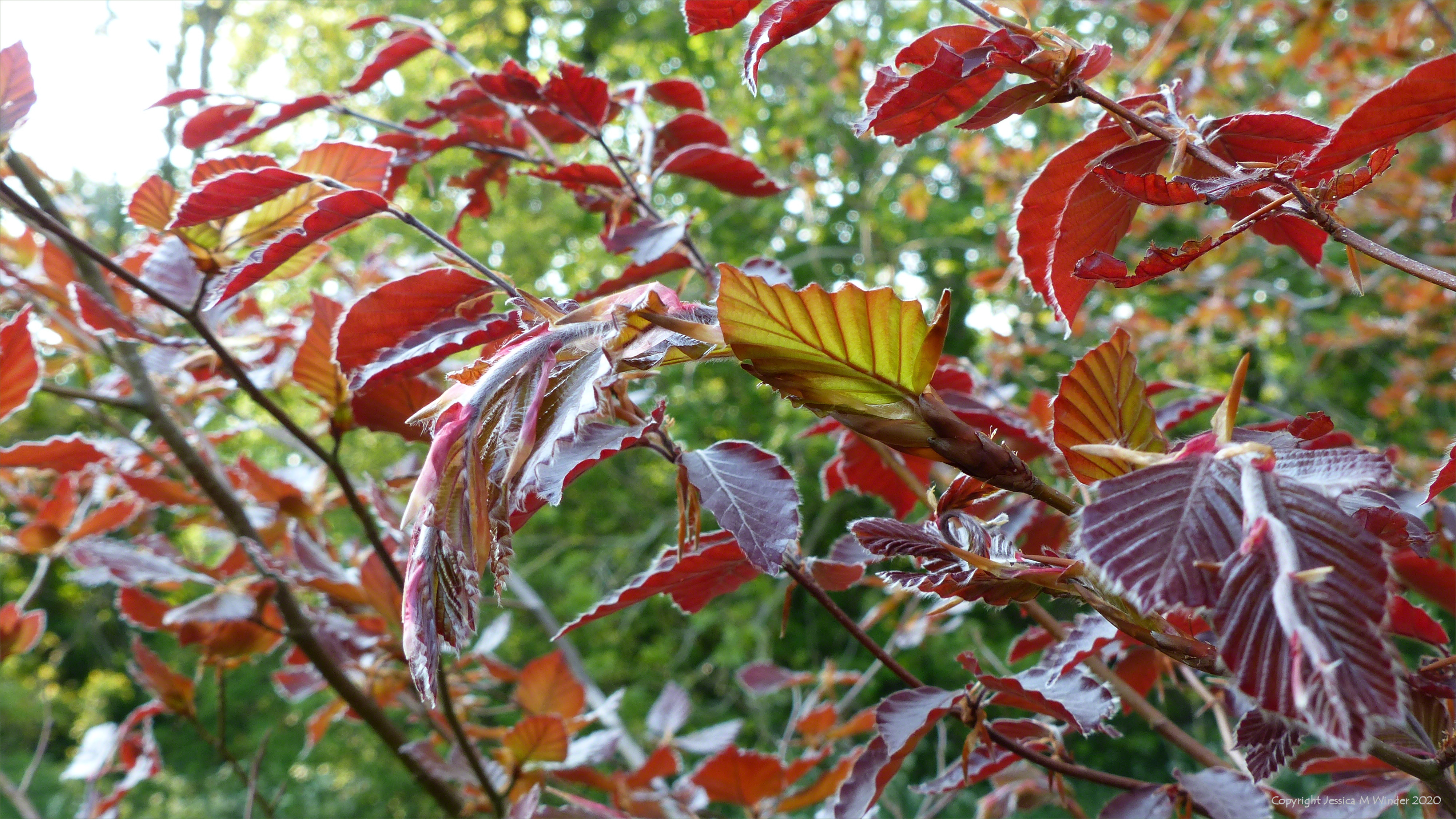 Copper Beech leaves photographed in April 2020 while on the daily permitted walk during the coronavirus lockdown in Charlton Down in Dorset.