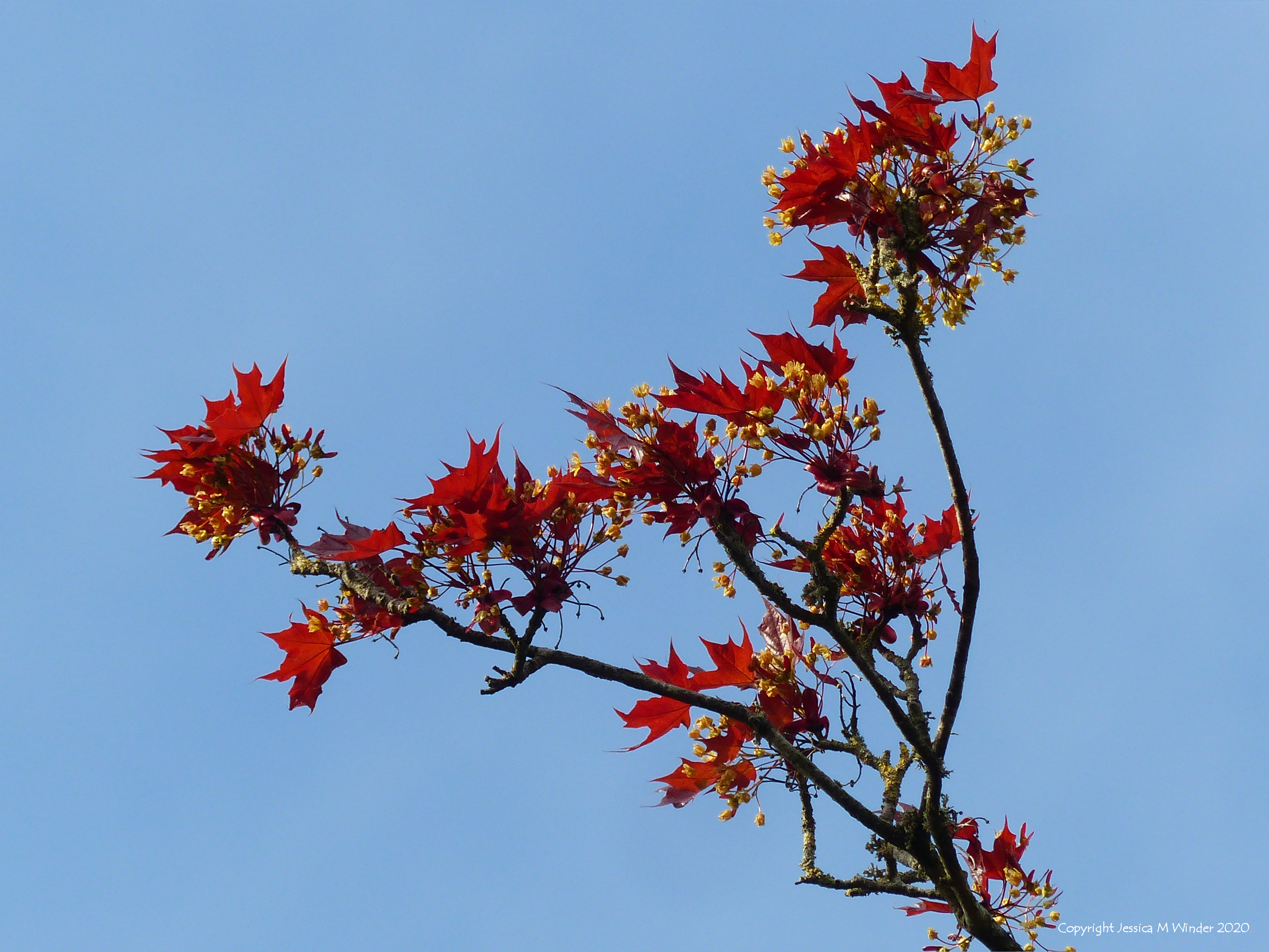 Yellow flowers and red leaves opening on a type of Norway Maple tree at Charlton Down in Dorset during the springtime lockdown of the coronavirus outbreak 2020