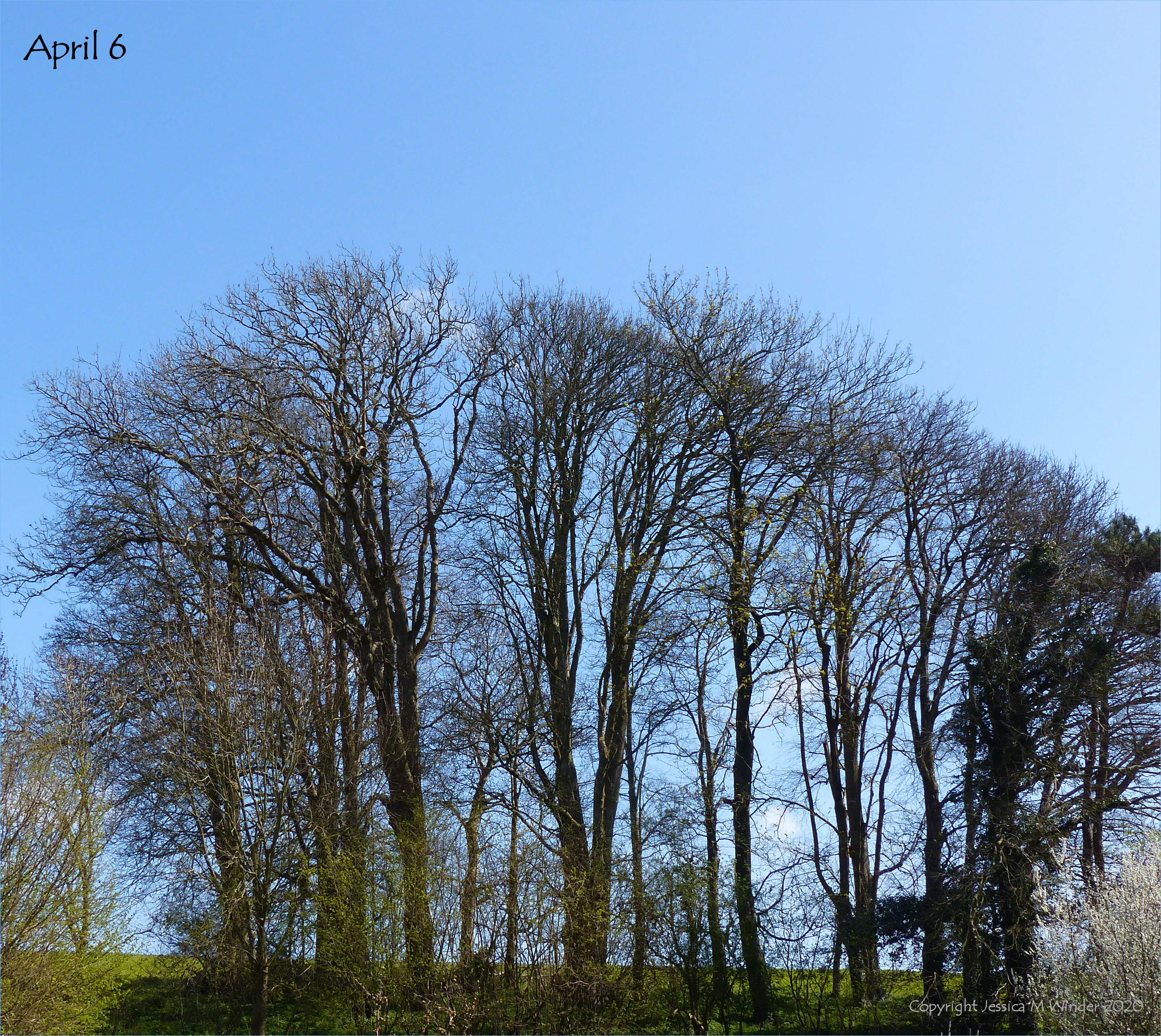 Line of trees with the merest hint of green on the bare branches in the Charlton Down Nature Area on April 6 2020, photographed during the daily walk permitted in the coronavirus lockdown.