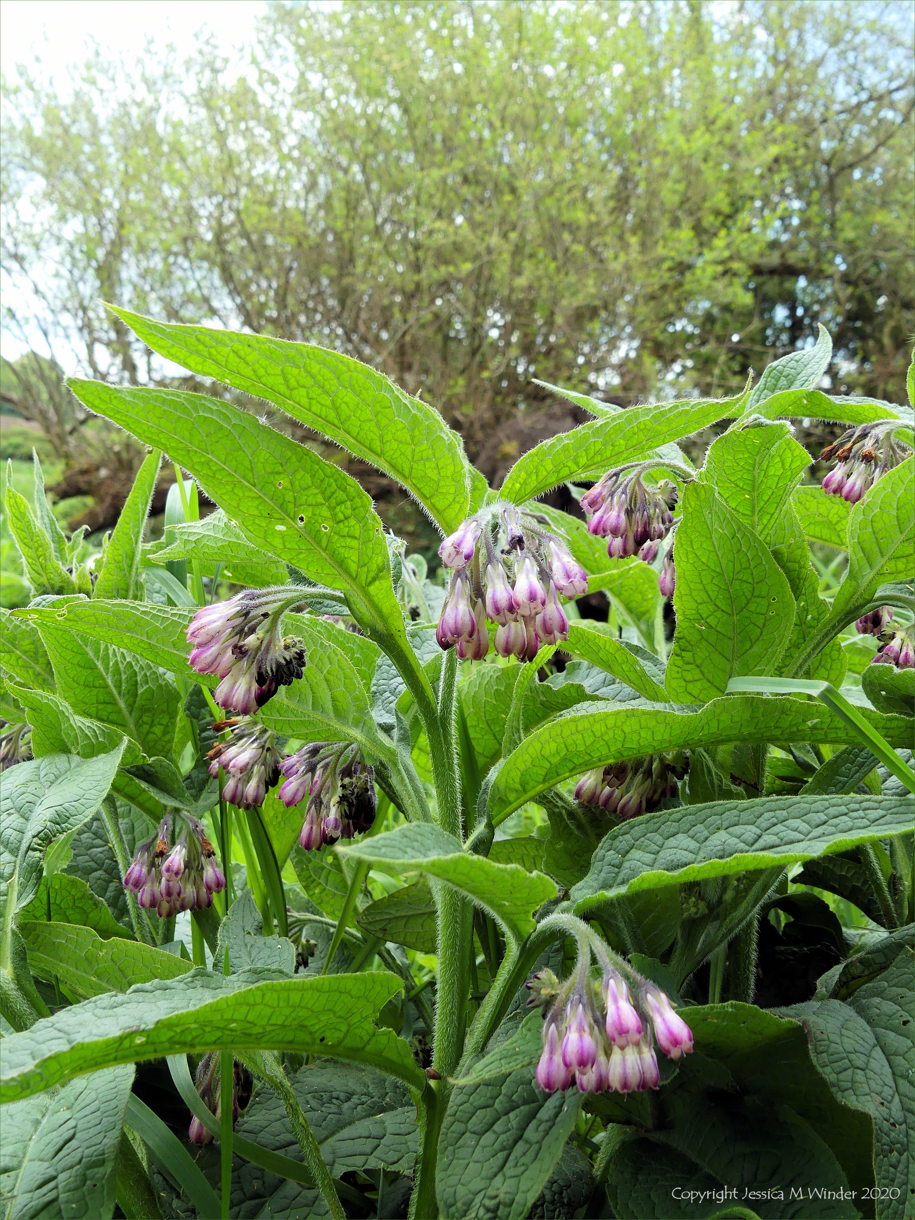 Wild Comfrey (Symphytum sp.) on the riverbank near Charlton Down in Dorset, photographed during the daily permitted outside exercise excursion during the coronavirus lockdown, 1st May 2020.