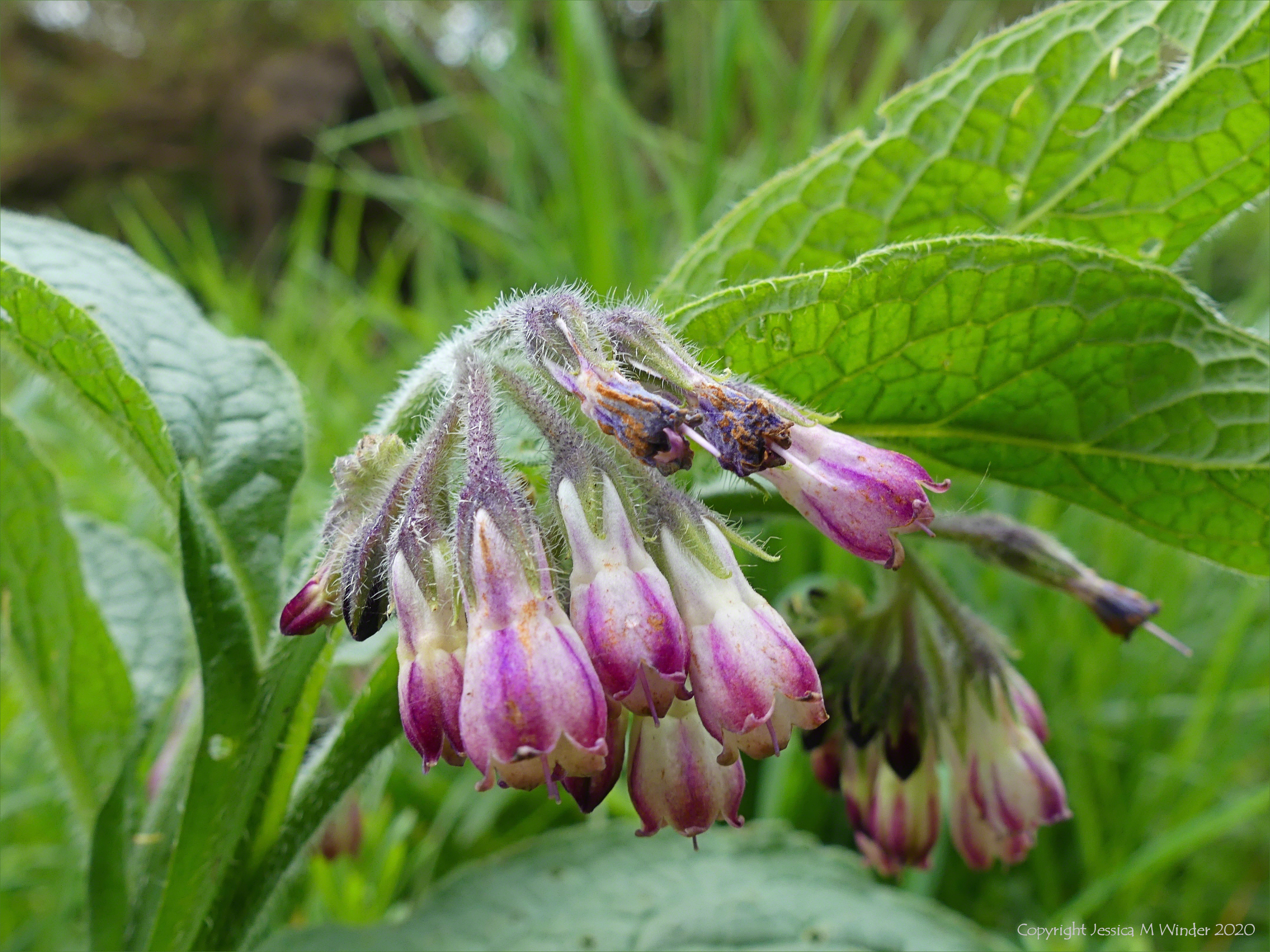 Wild Comfrey (Symphytum sp.) on the riverbank near Charlton Down in Dorset, photographed during the daily permitted outside exercise excursion during the coronavirus lockdown, 1st May 2020.