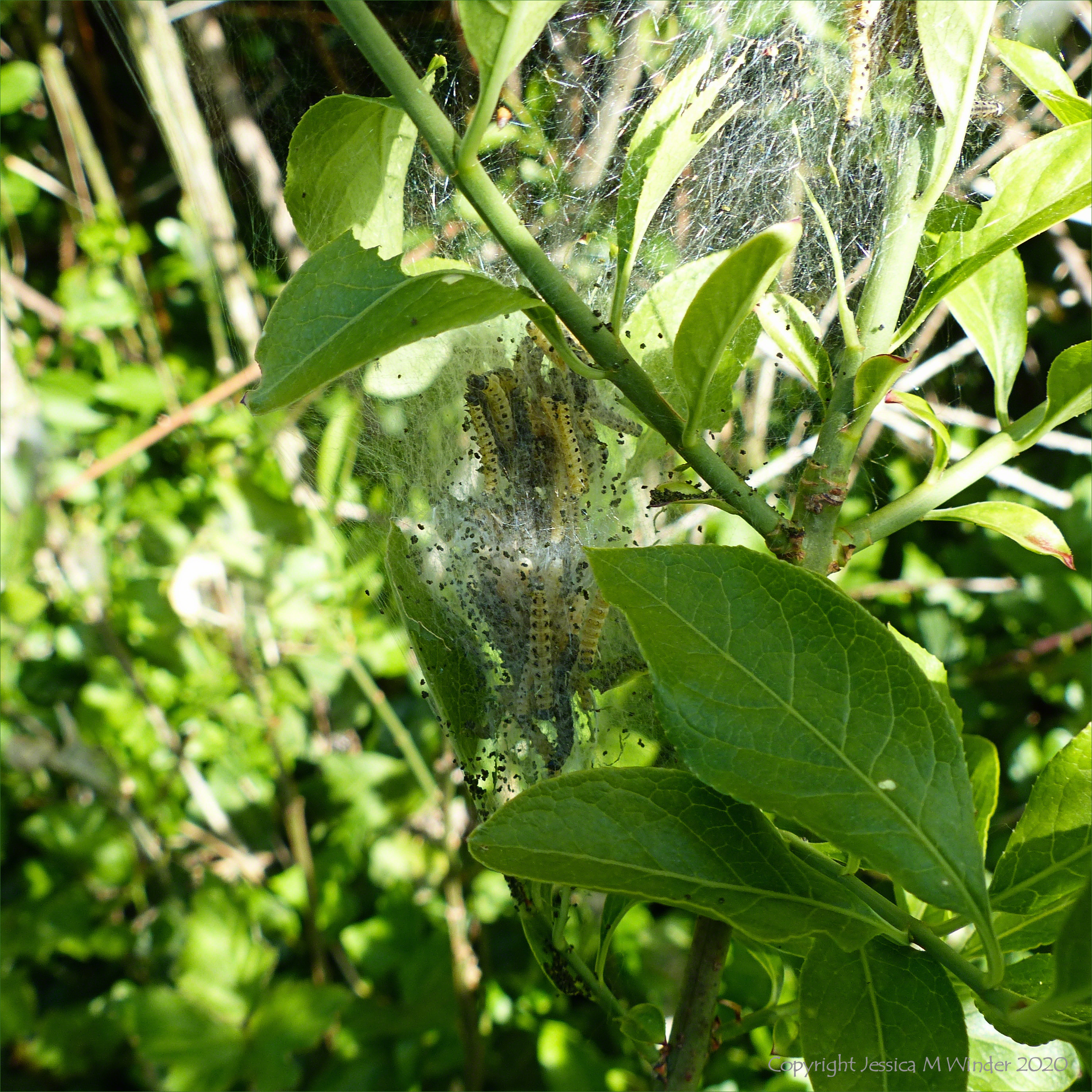 Nests of silken threads protecting the larvae of ermine moths (Yponomeuta spp.) on a hedgerow in Charlton Down, Dorset, 9 May 2020, during the period of the coronavirus lockdown.