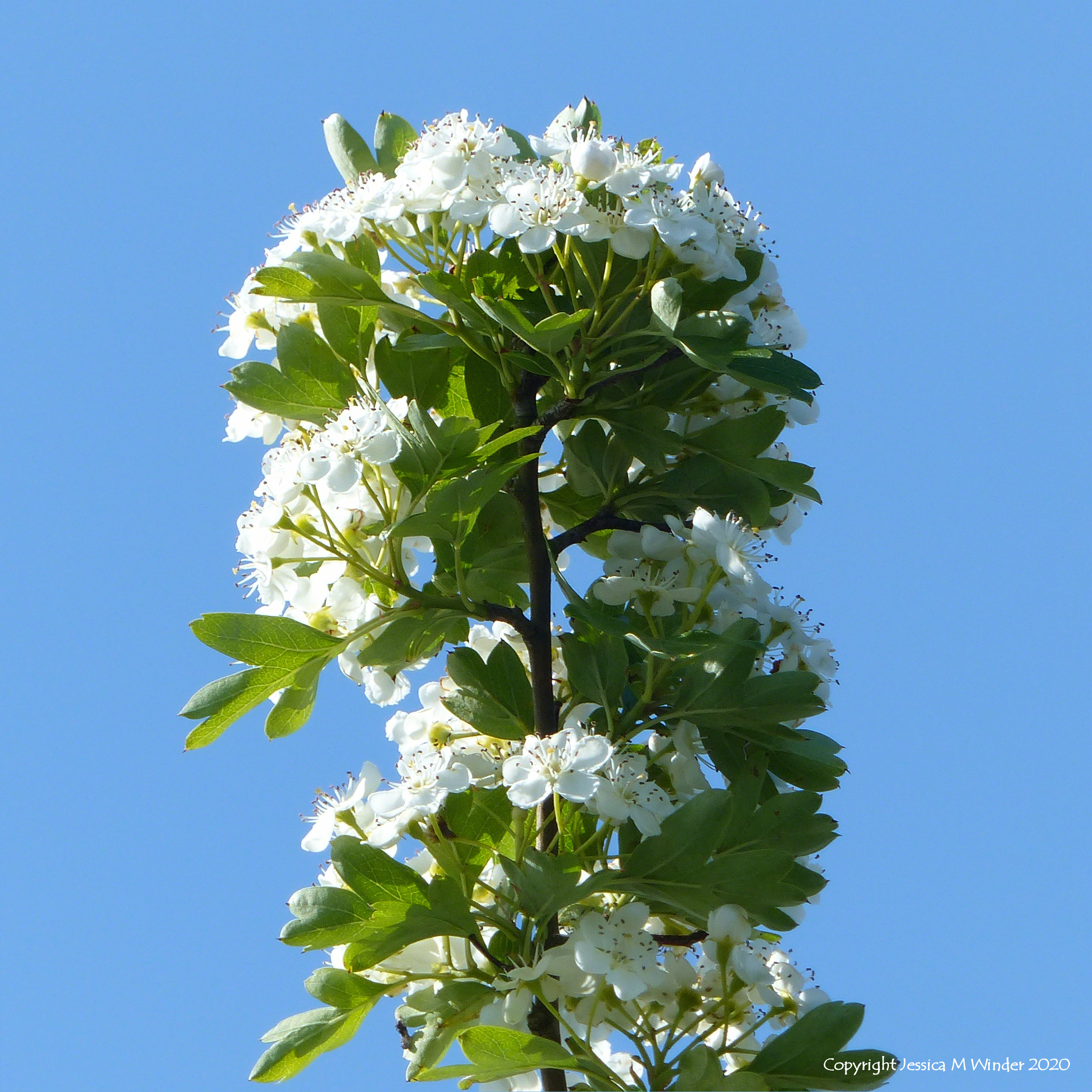 White flowers of Hawthorn (Crataegus monogyna) in the hedgerows around the village of Charlton Down in Dorset, photographed while taking the daily permitted walk during the coronavirus lockdown, Mat 2020.