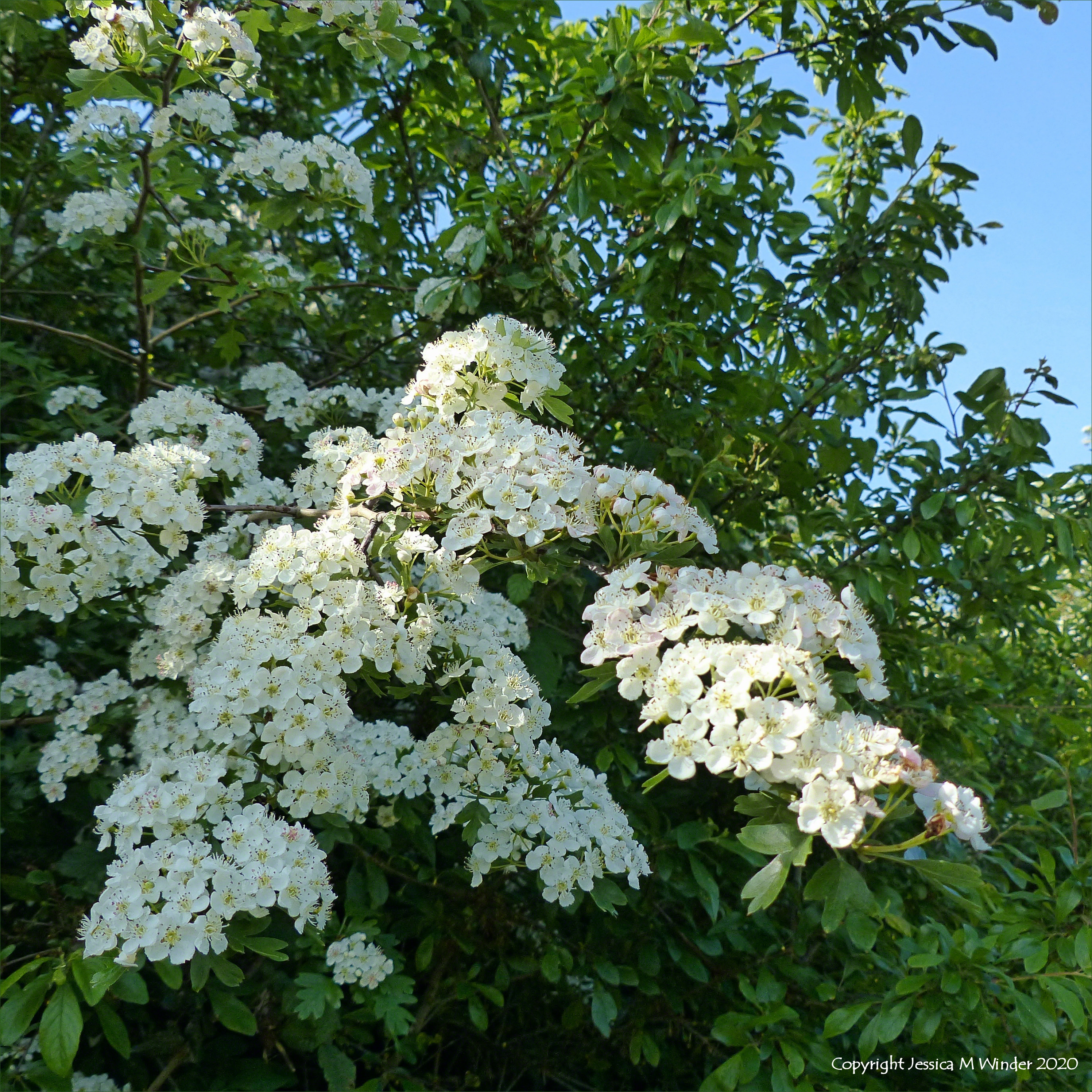 White flowers of Hawthorn (Crataegus monogyna) in the hedgerows around the village of Charlton Down in Dorset, photographed while taking the daily permitted walk during the coronavirus lockdown, Mat 2020.