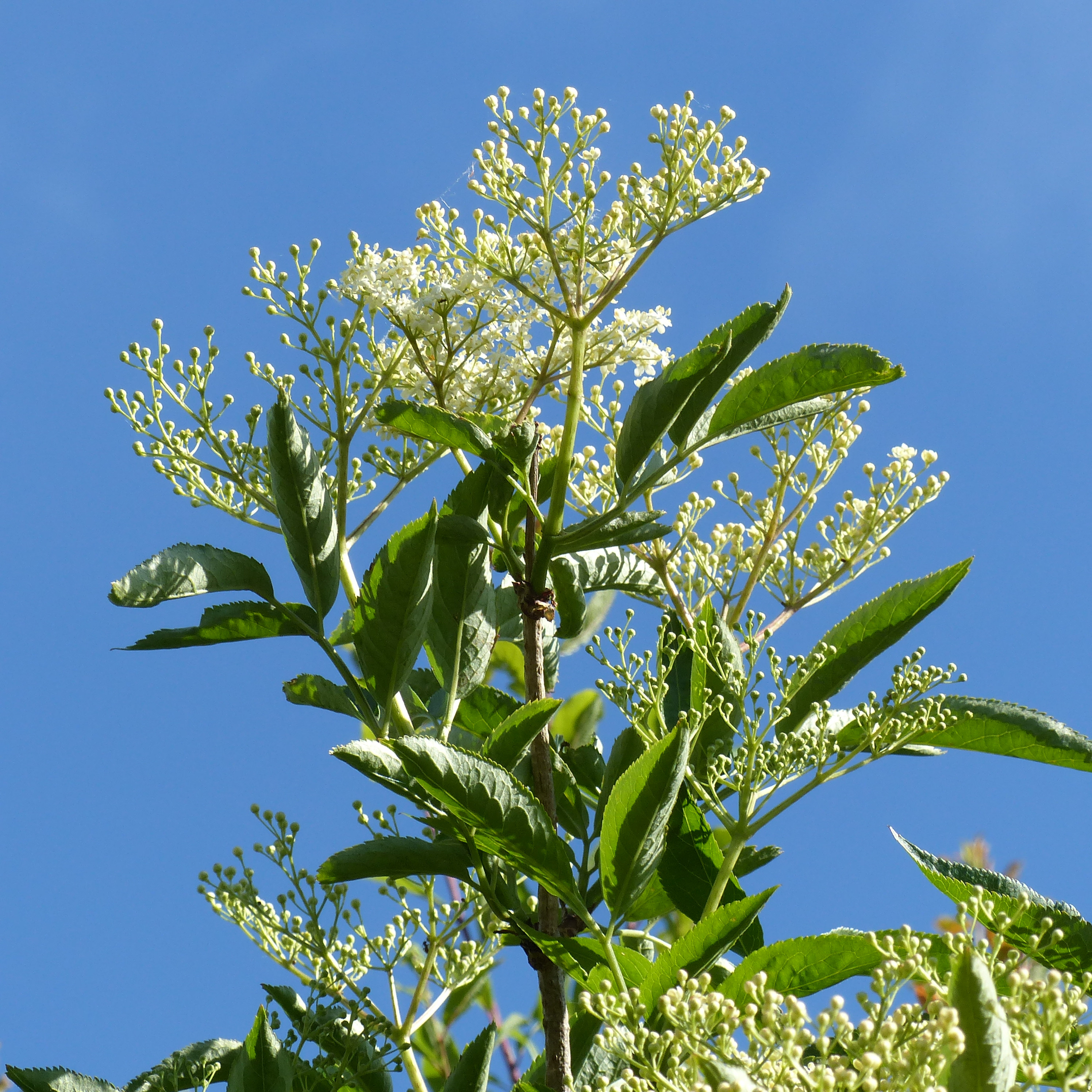 Flowers of Elder (Sambucus nigra) in a hedgerow at Charlton Down in Dorset, May 2020, photographed during the coronavirus lockdown.