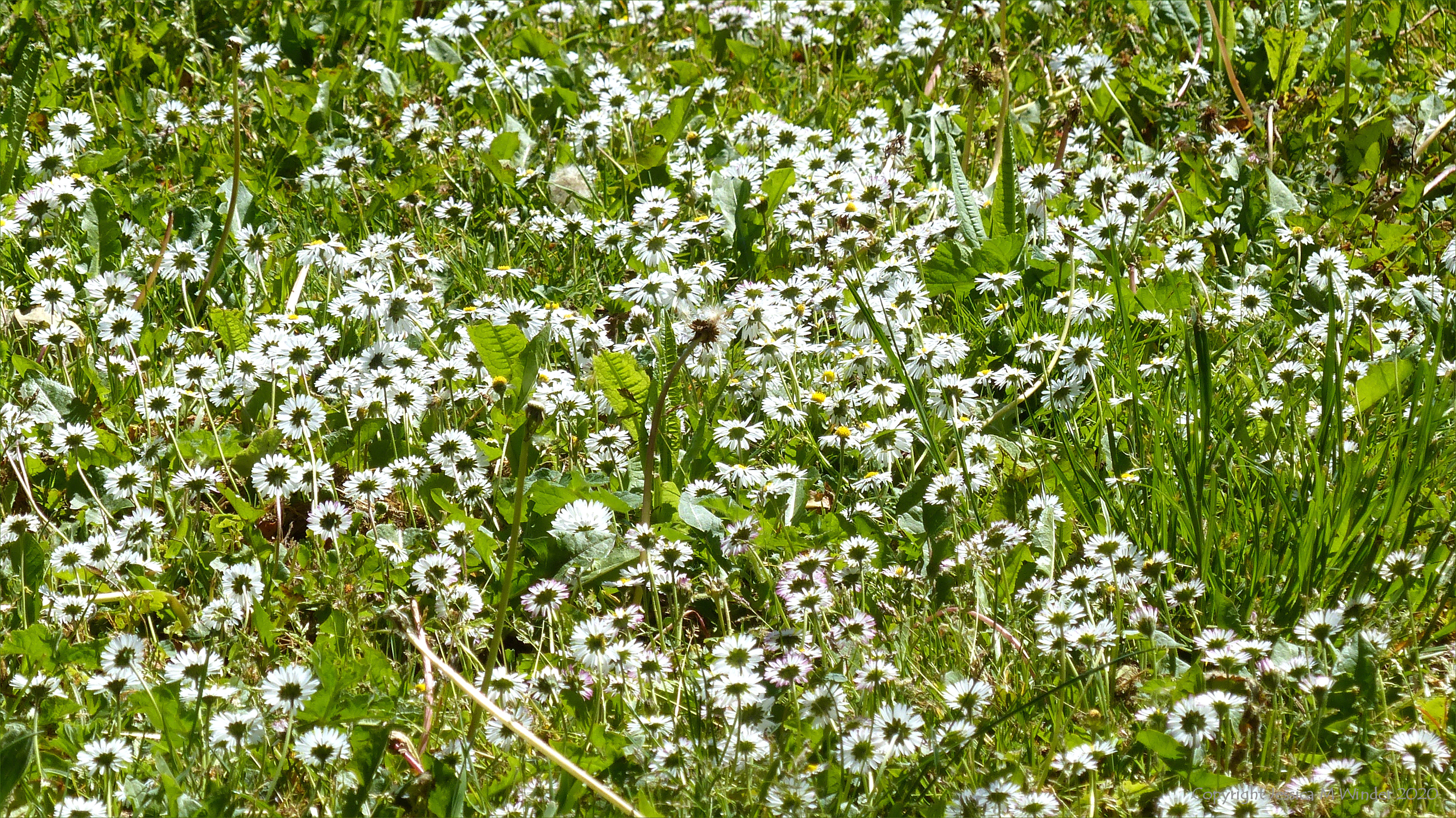 Daisies showing the undersides of the flowers, all pointing away from the shade towards the sun, in the playing field at Charlton Down in Dorset, photographed during the coronavirus lockdown May 2020.
