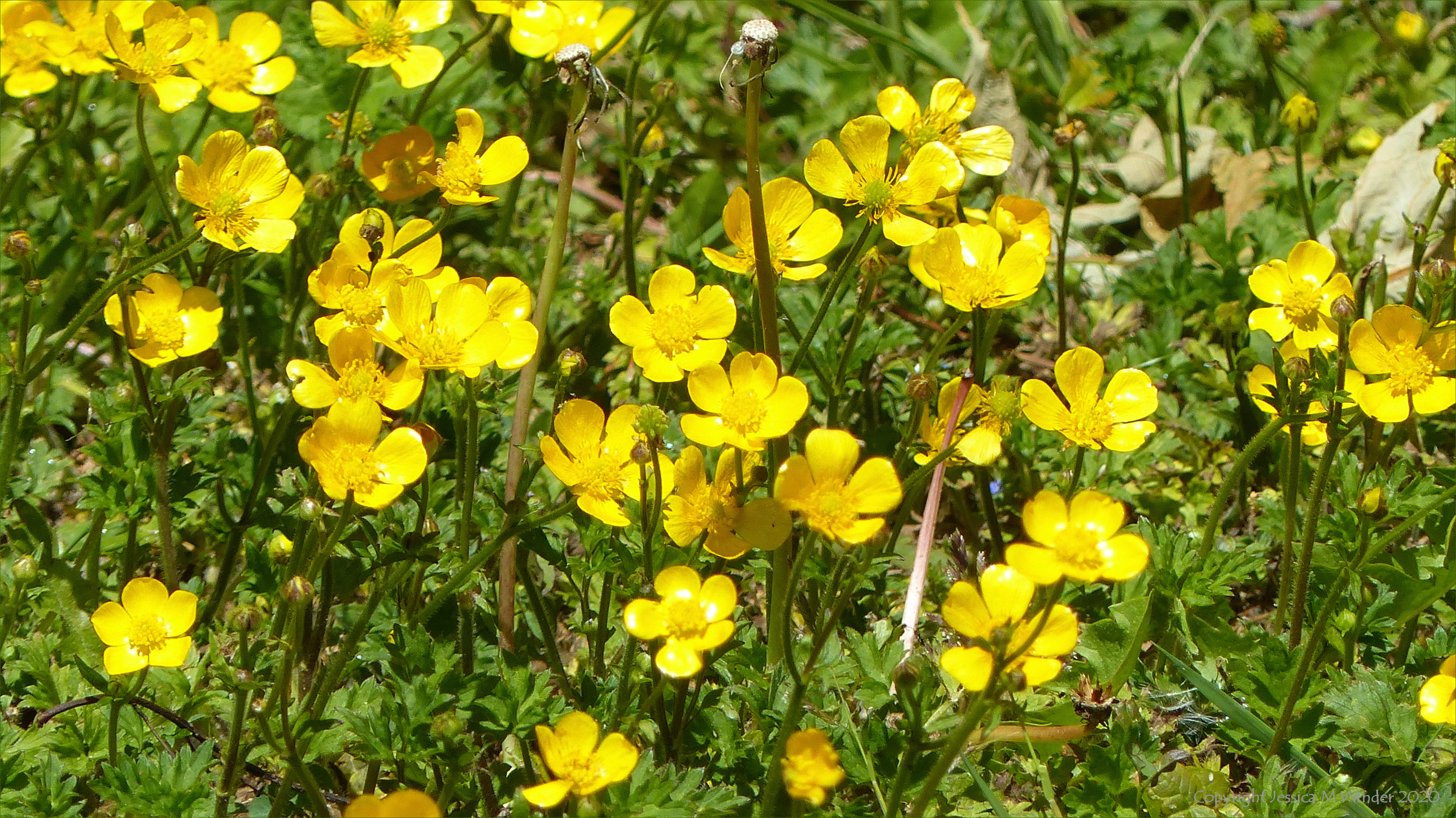 Buttercups sunny side up, in the playing field at Charlton Down in Dorset, photographed during the coronavirus lockdown May 2020.