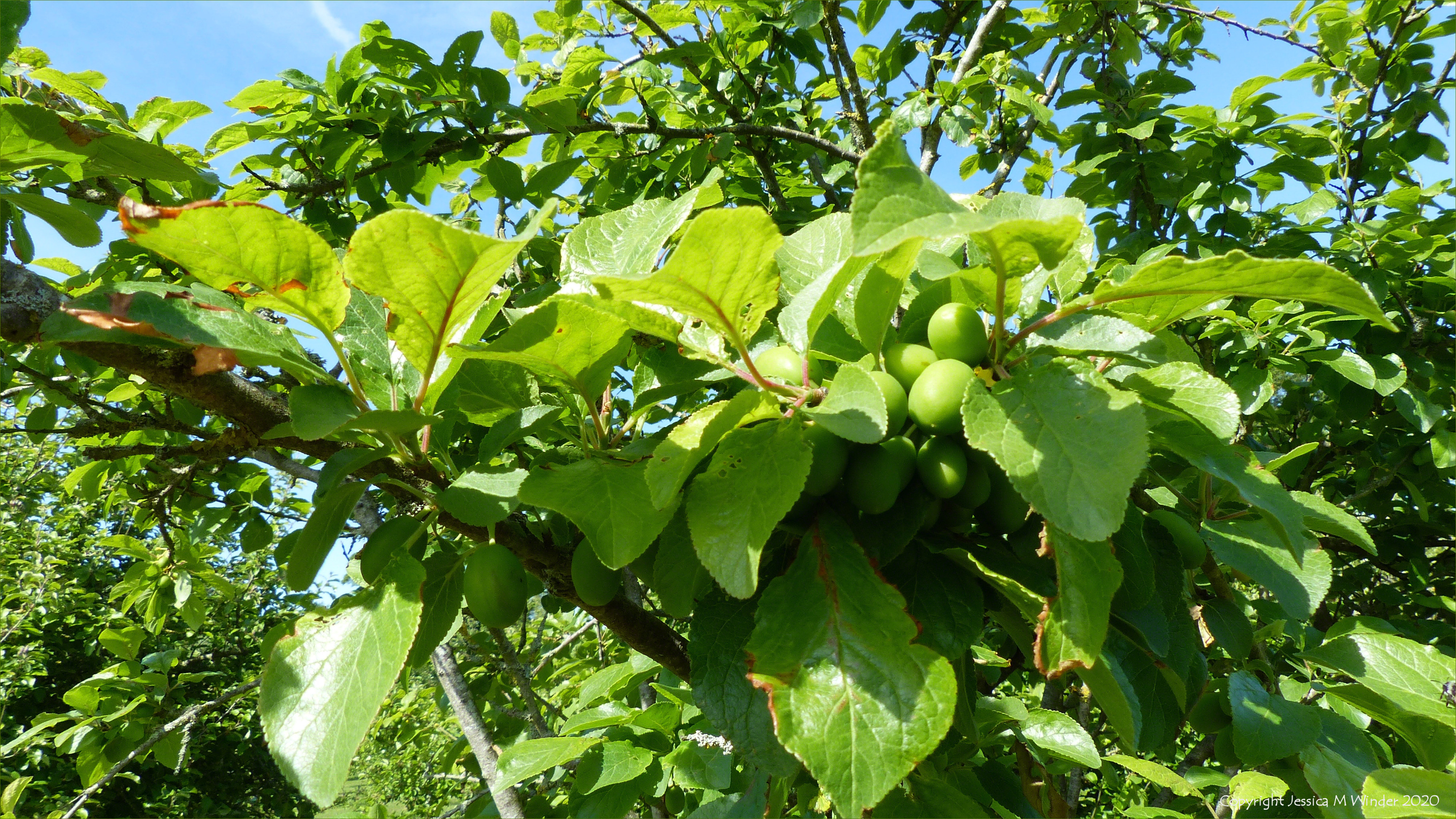 Daily Walk 59.6 Small plums developing on the trees in the Community Orchard at Charlton Down in Dorset May 2020