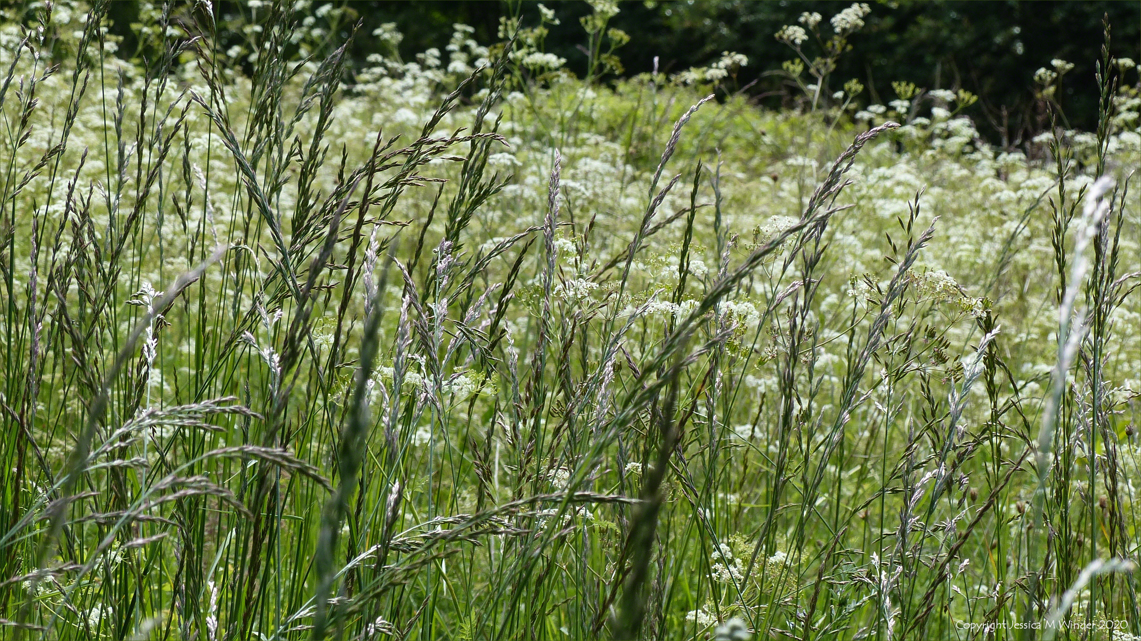 Tall grasses flowering in the meadow at Charlton Down in Dorset. Photographed during the coronavirus lockdown May 2020.