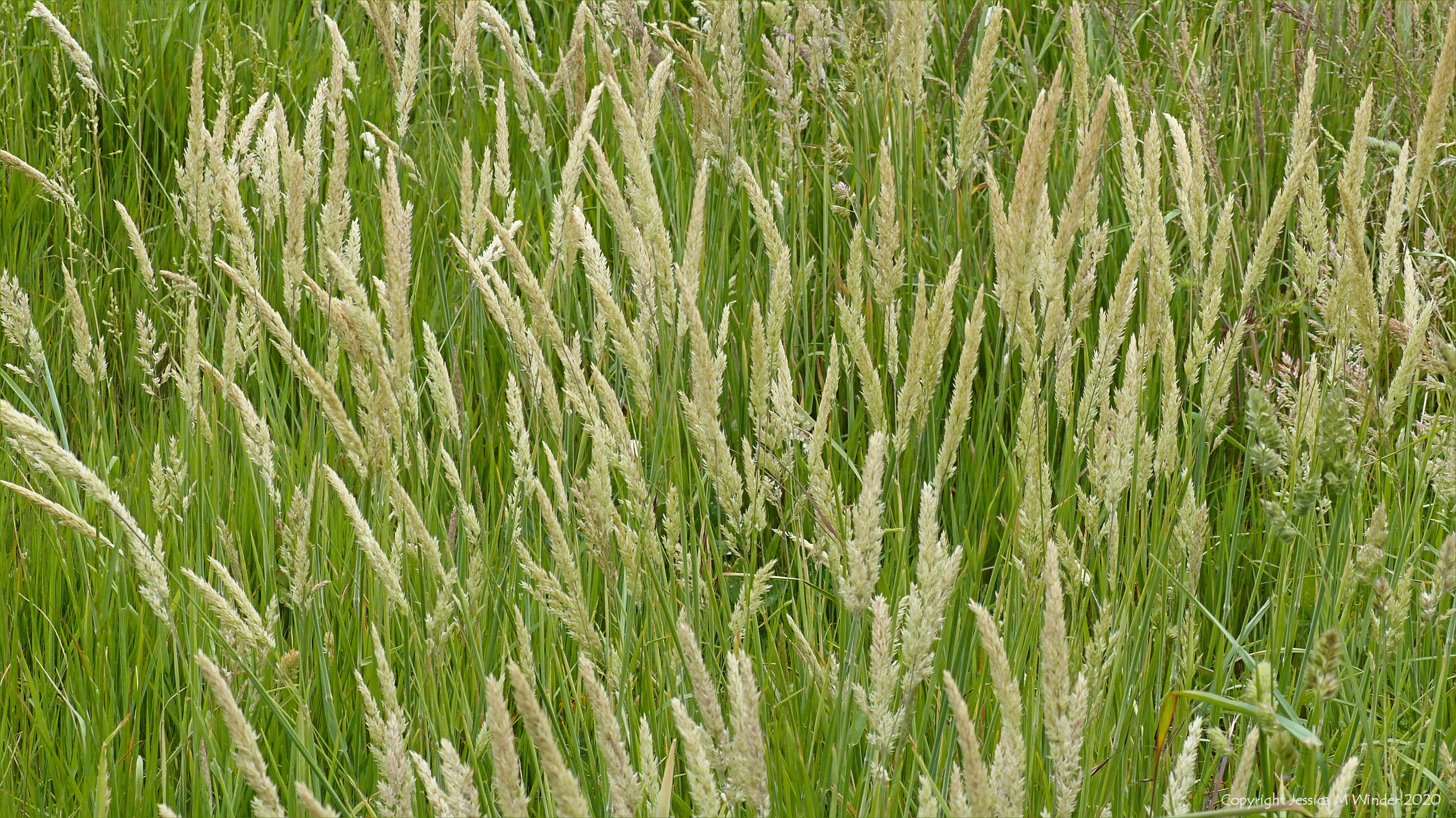 Flowering grasses in the wilding field at the start of the upper footpath from Charlton Down to the neighbouring village of Charminster in Dorset, 6 June 2020.