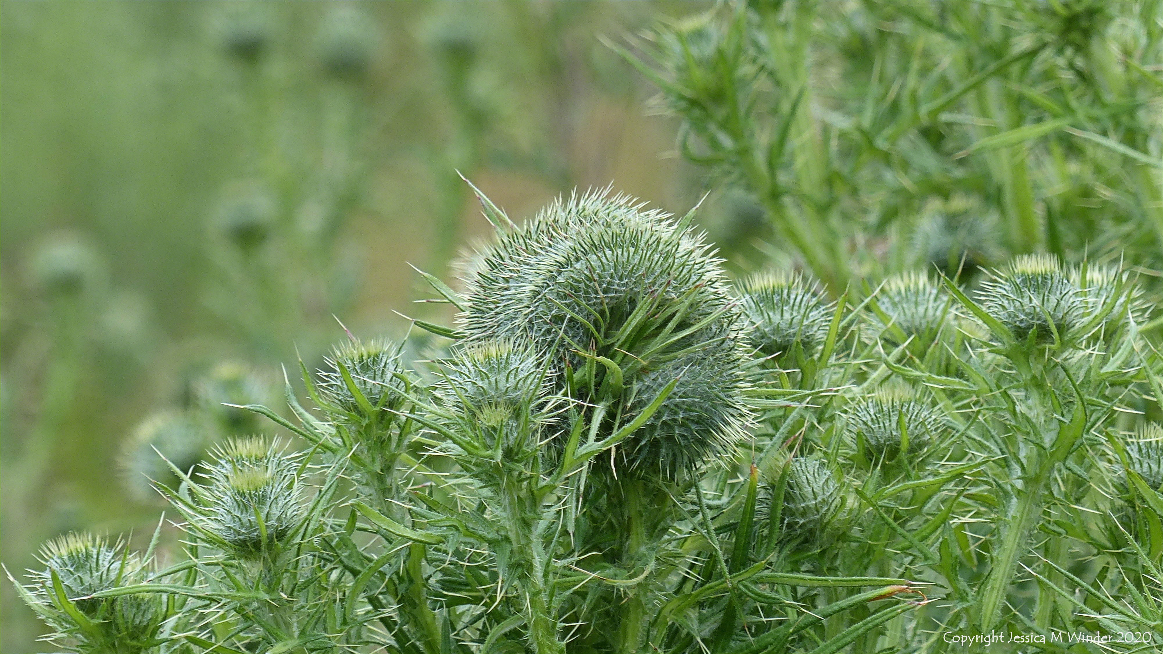 Fasciated (mutated) thistle unopened flower bud at Charlton Down in Dorset June 2020
