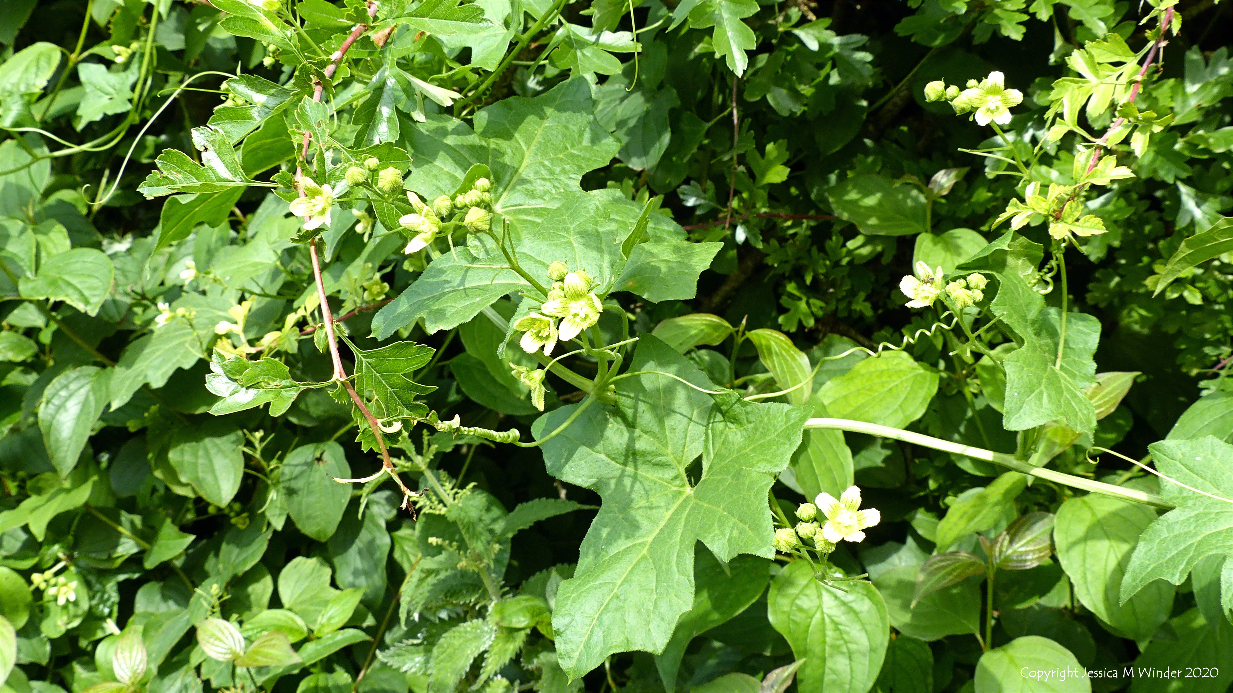 Daily Walk 87.5 White Bryony flowers (Bryonia dioica) growing in a hedgerow at Charlton Down in Dorset June 2020.