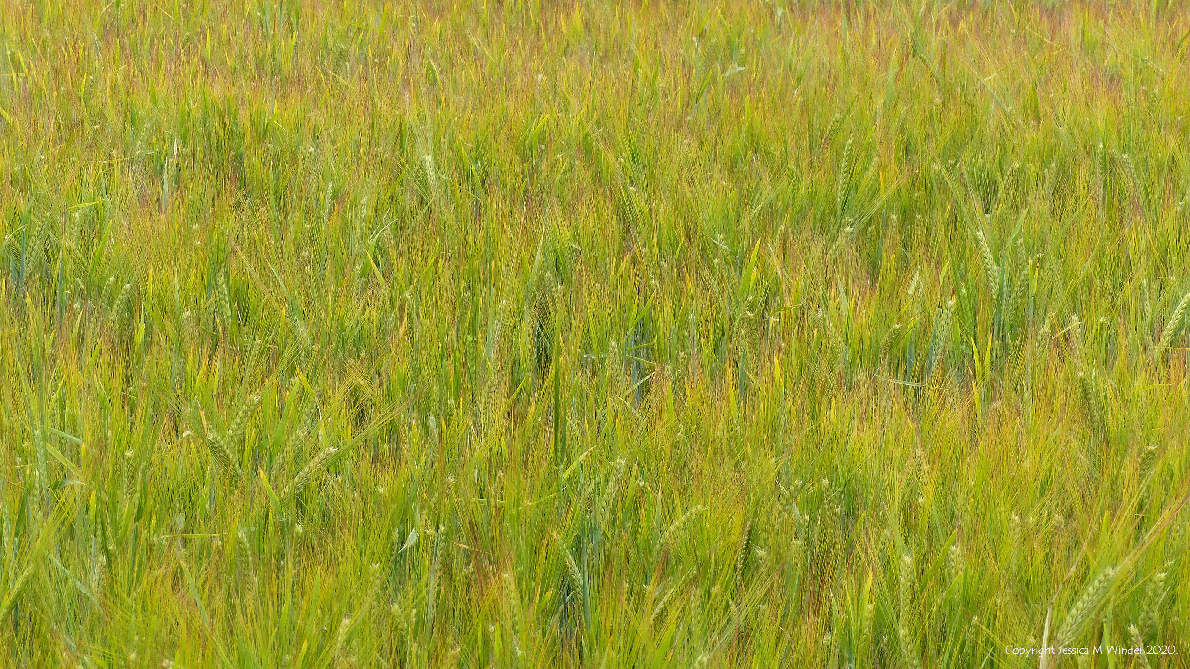 Late-sown barley field (or is it rye?) with red sun-scorched whiskers on the seed heads, at Charlton Down in Dorset, June 2020.