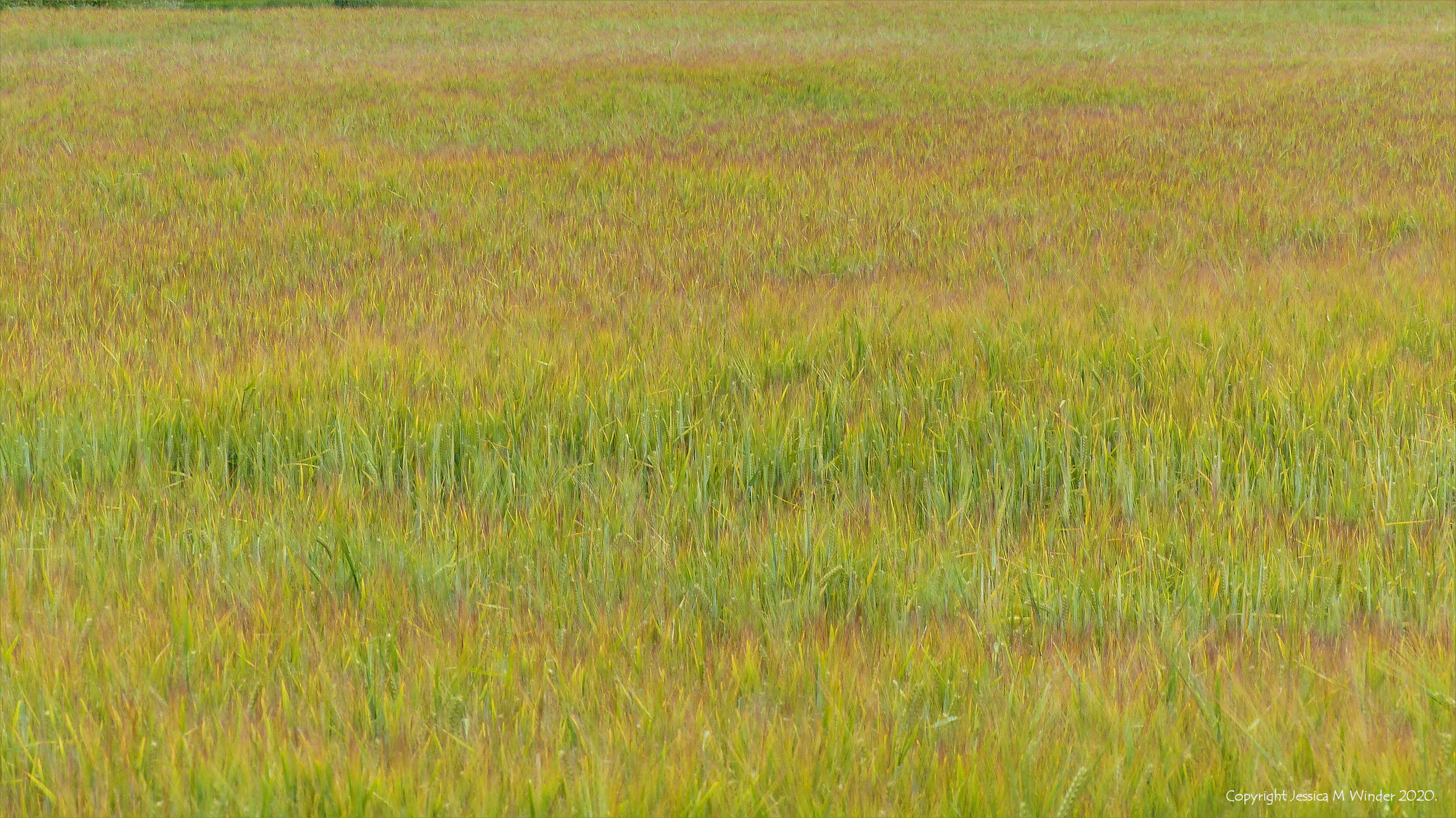 Late-sown barley field (or is it rye?) with red sun-scorched whiskers on the seed heads, at Charlton Down in Dorset, June 2020.