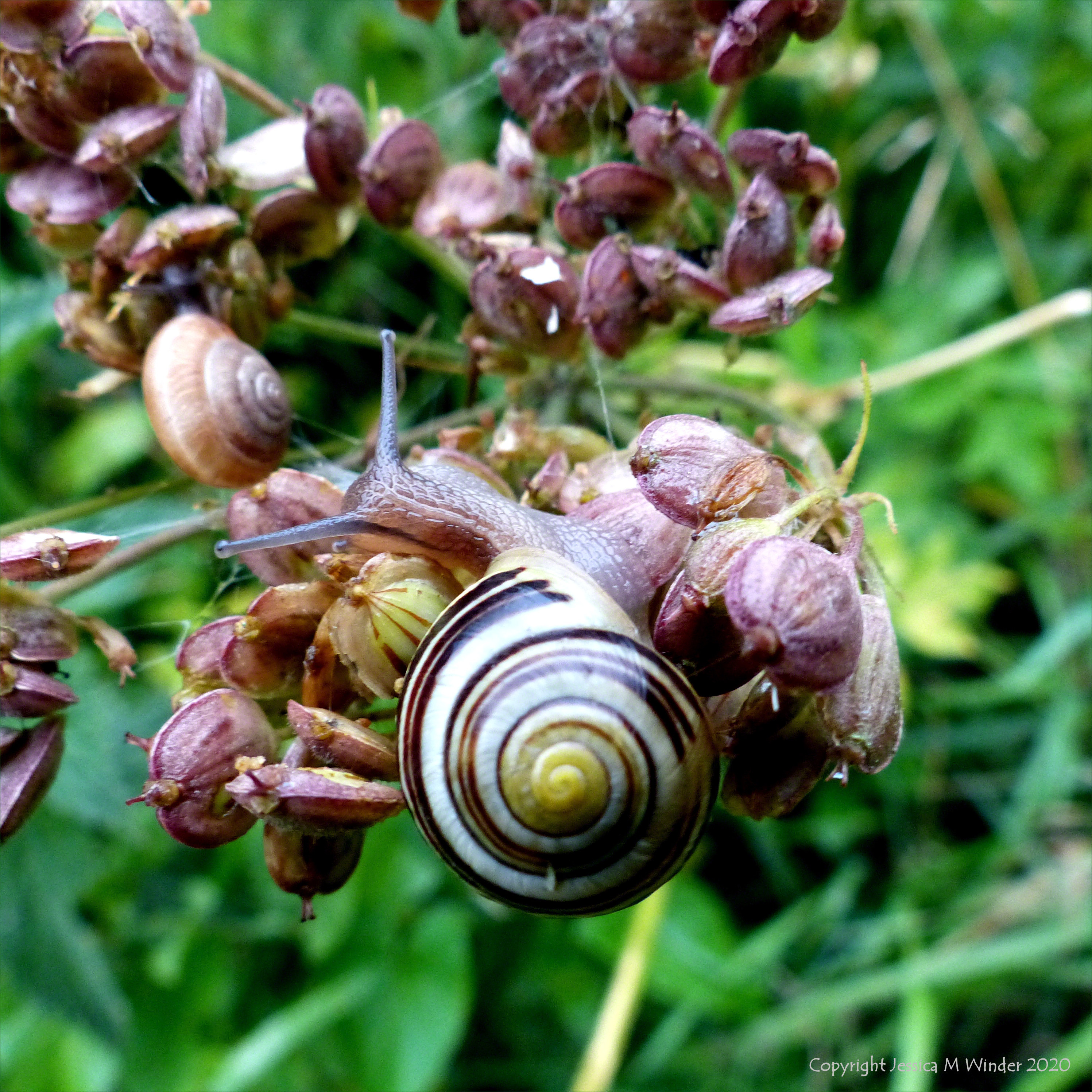 Daily Walk 90.6 Common British snail feeding one damp evening in the quiet and cool at Charlton Down in Dorset, June 30th 2020