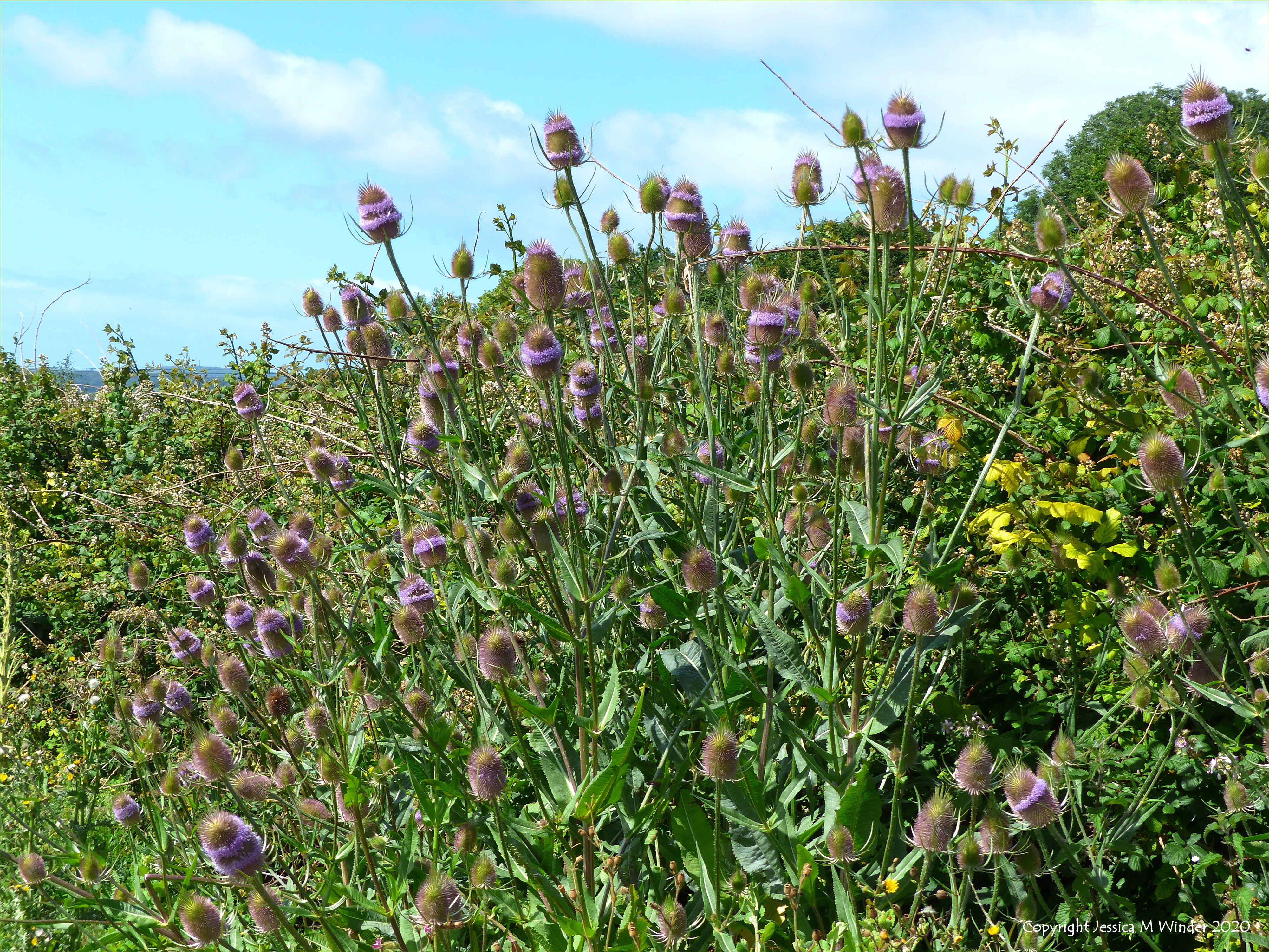 Daily Walk 96.1 Wild Teasel (Dipsacus fullonum) flowering in a hedgerow at Charlton Down in Dorset 5th July 2020.
