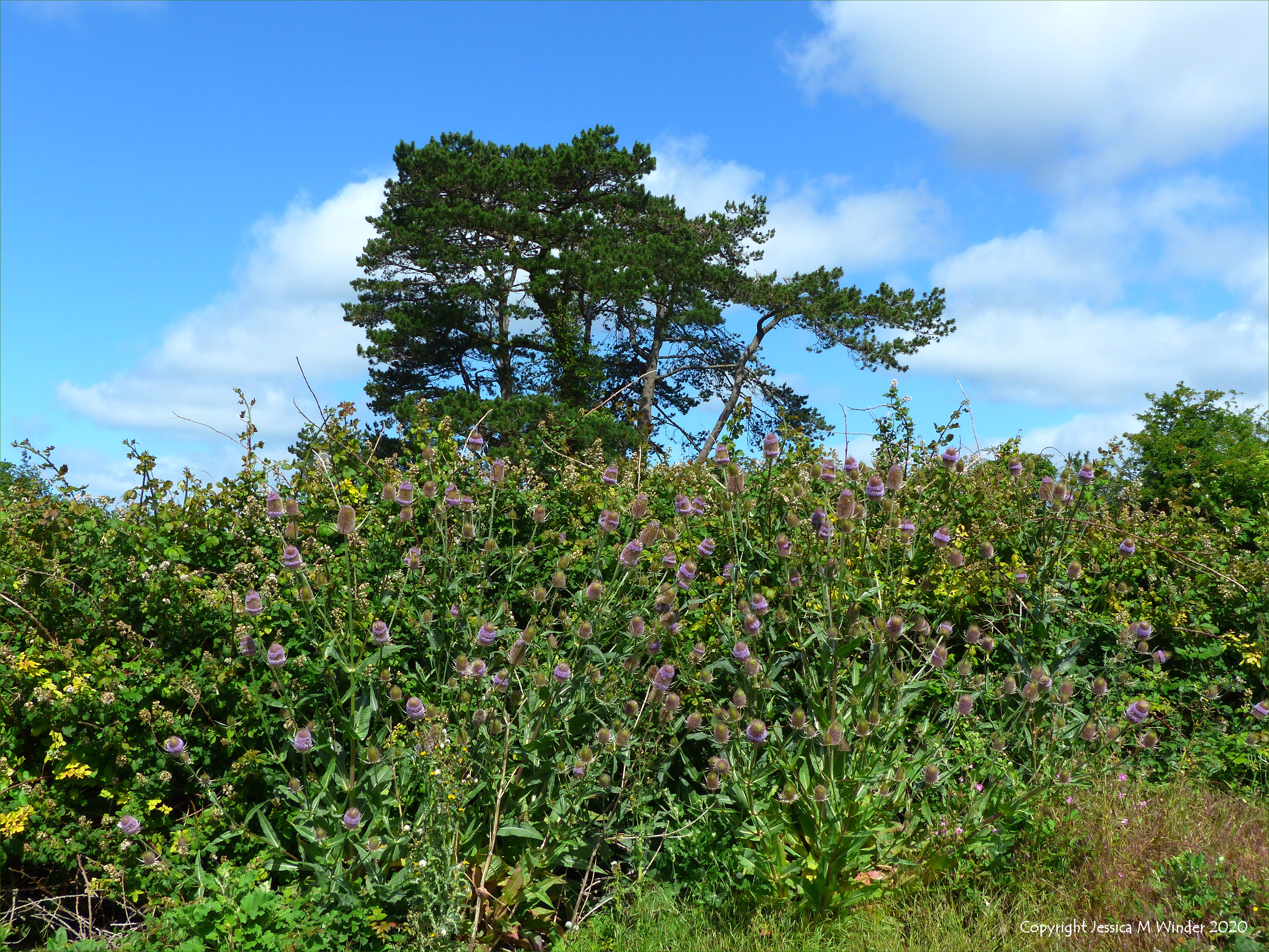 Daily Walk 96.8 Wild Teasel (Dipsacus fullonum) flowering in a hedgerow at Charlton Down in Dorset 5th July 2020.