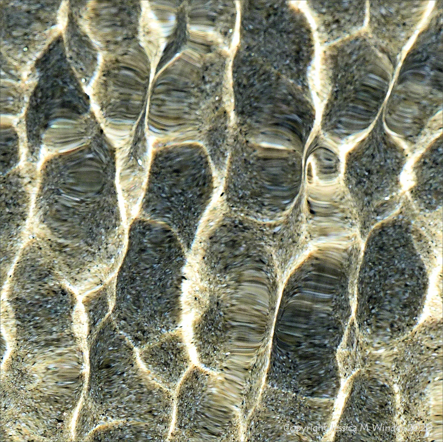 Refracted light patterns on shallow tide pool rippled water on the sandy beach at Pembroke Bay on Guernsey in the Channel Islands,
