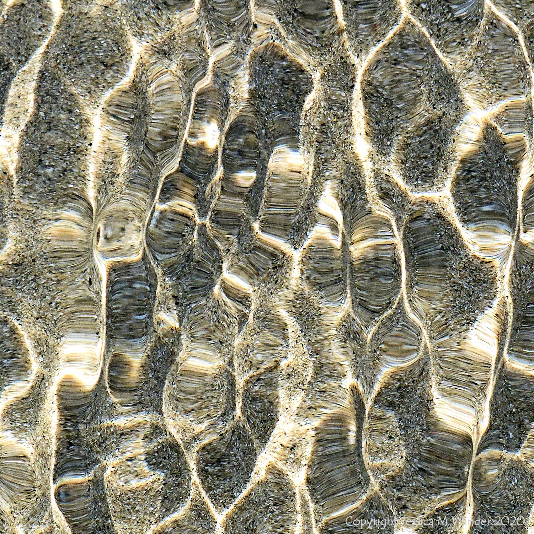 Refracted light patterns on shallow tide pool rippled water on the sandy beach at Pembroke Bay on Guernsey in the Channel Islands,