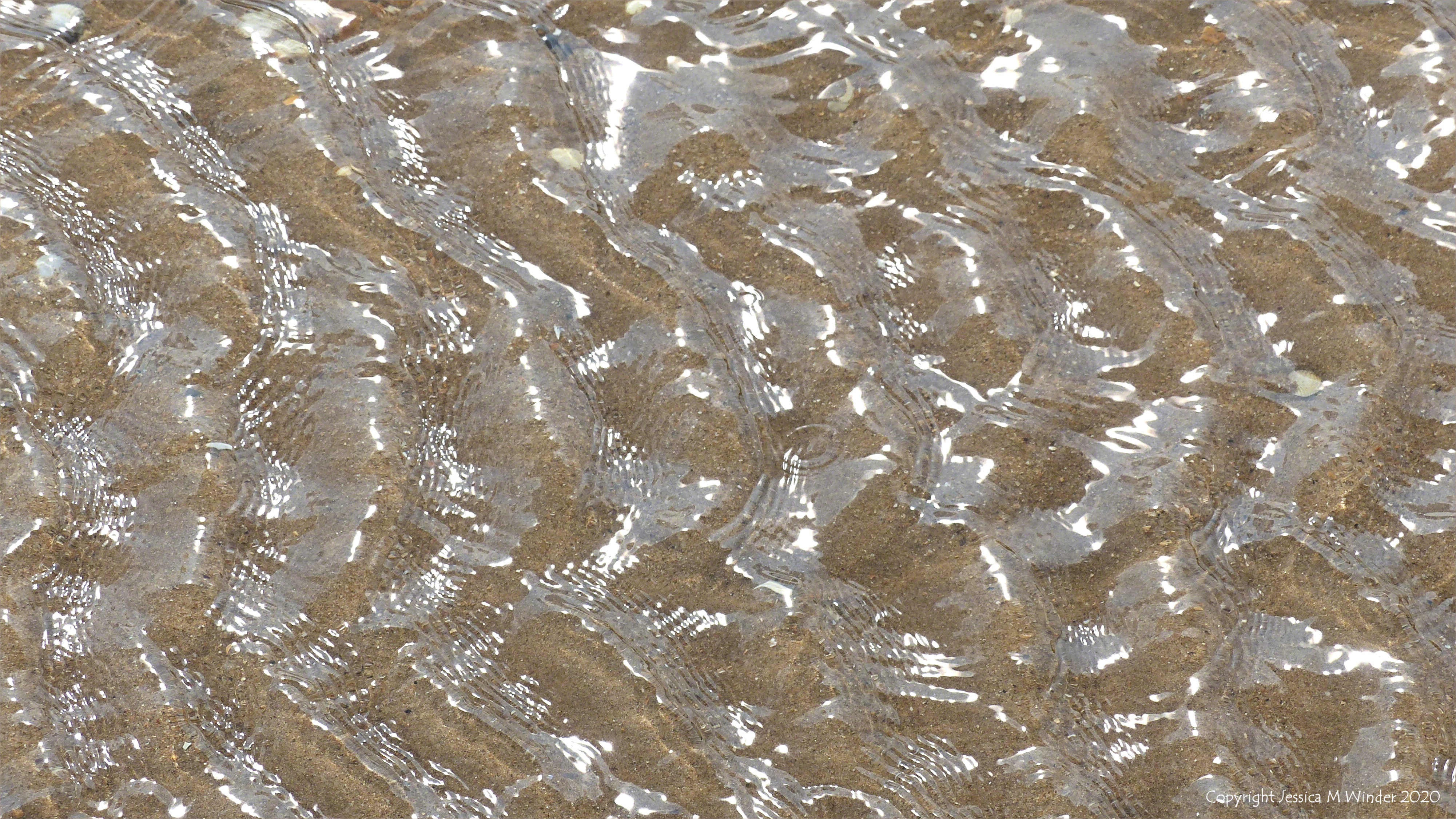 Patterns of reflected light on the surface of rippled water flowing in a small stream across the sandy beach at Swansea Bay in South Wales August 2019