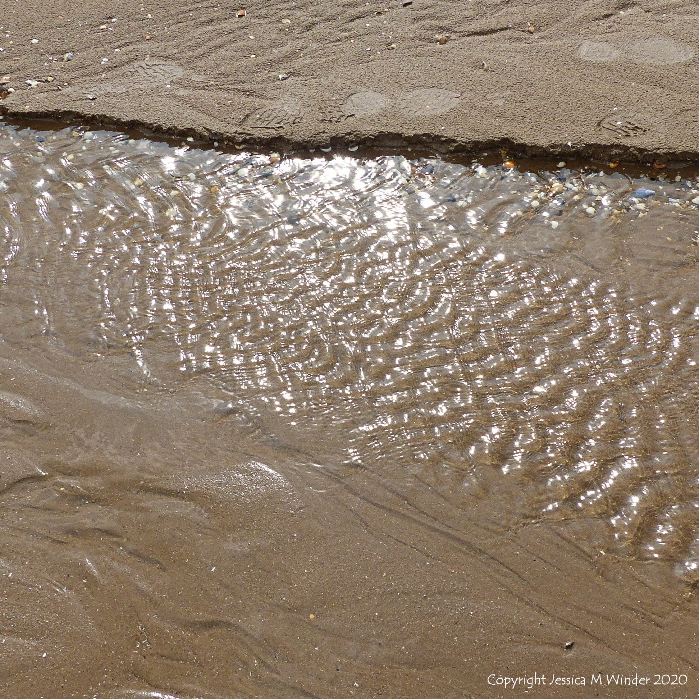 Patterns of reflected light on the surface of rippled water flowing in a small stream across the sandy beach at Swansea Bay in South Wales August 2019 – context shot for the close-ups.