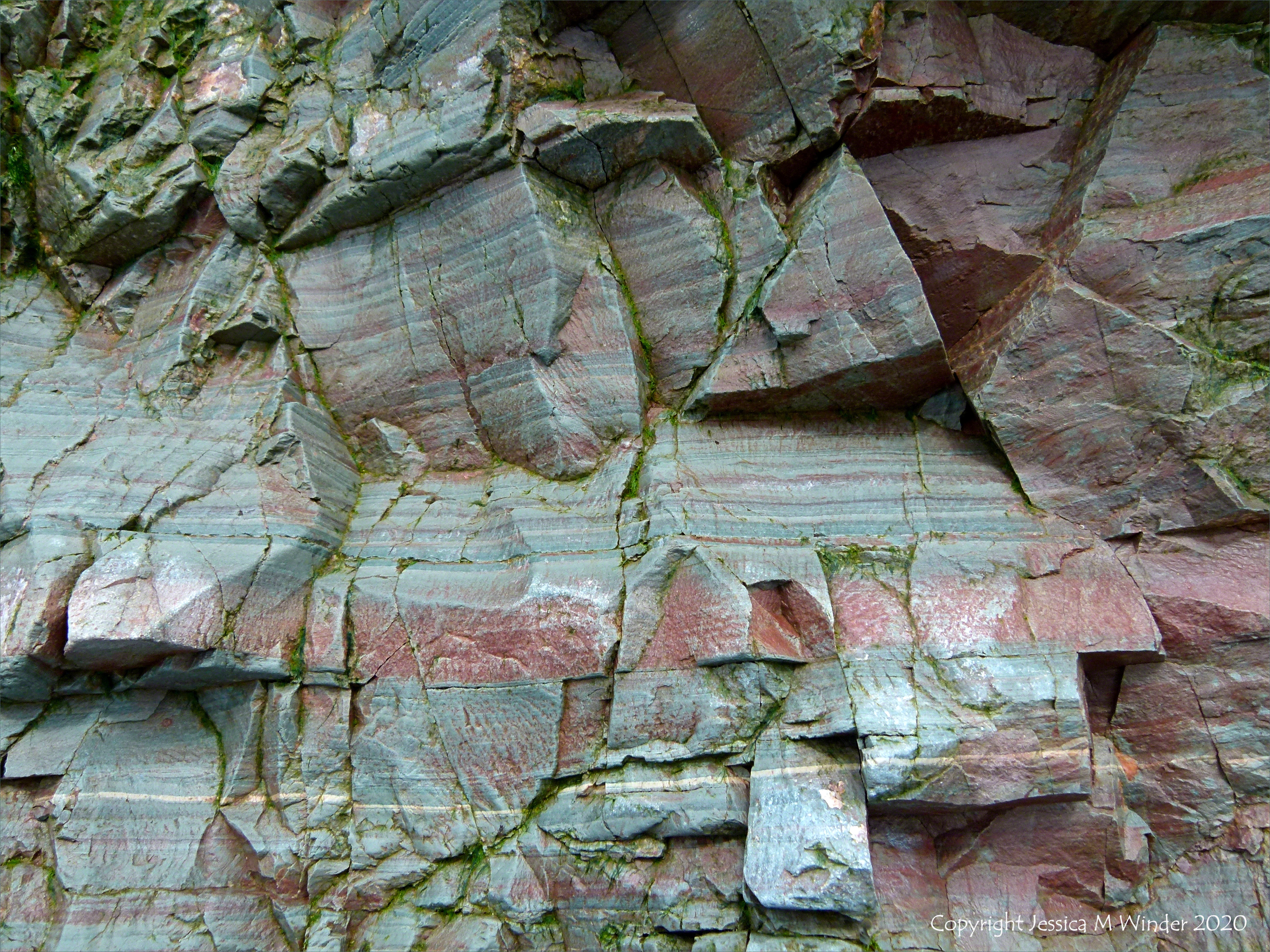 Natural abstract patterns and textures in red and green laminated meta-siltstone rocks