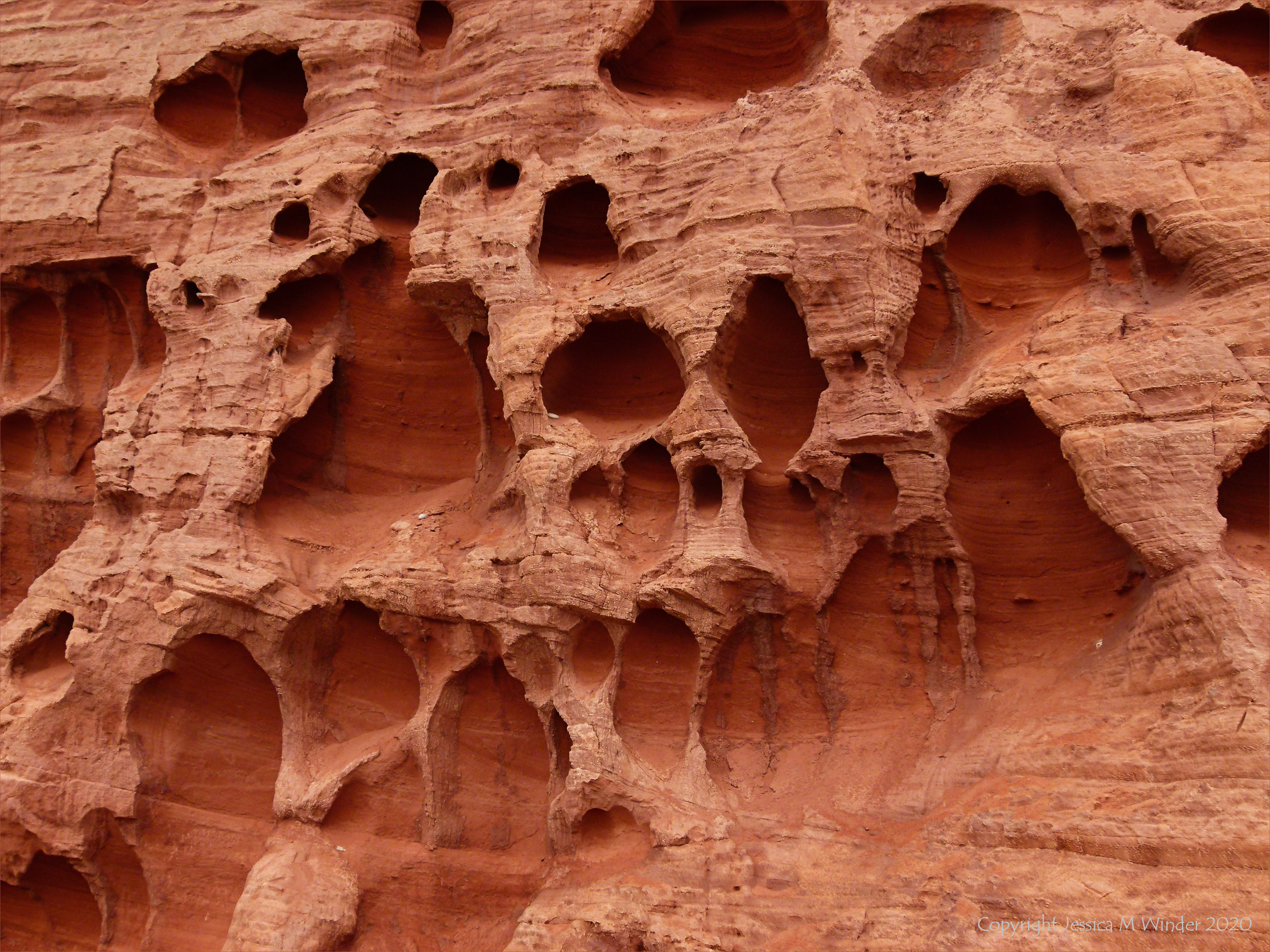 Honeycomb weathering or tafoni texture in red Otter Sandstone