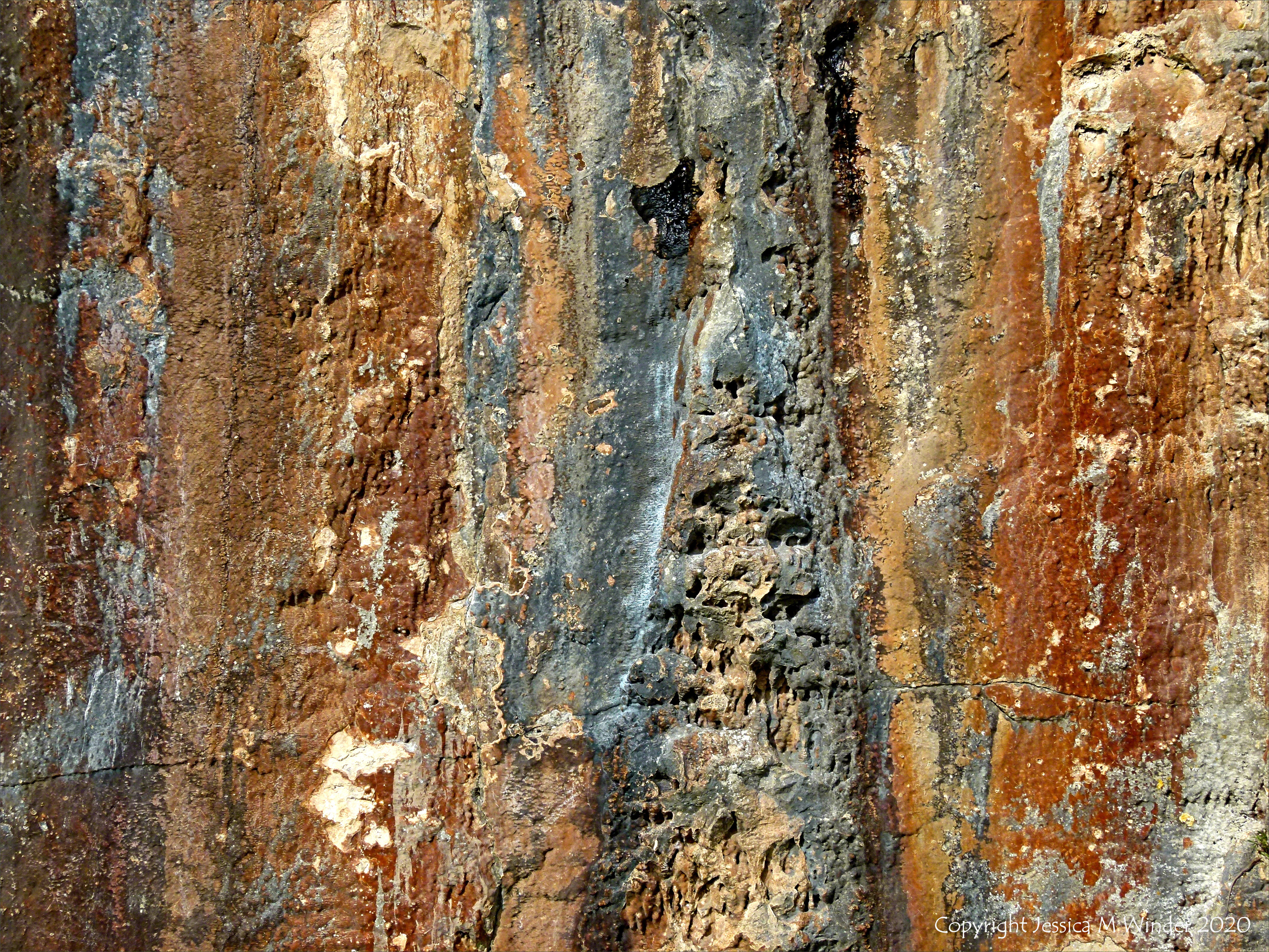 Rocks IOPJC 1 Iron-stained crystalline calcite deposited on the surface of quarried limestone rock, similar to travertine.