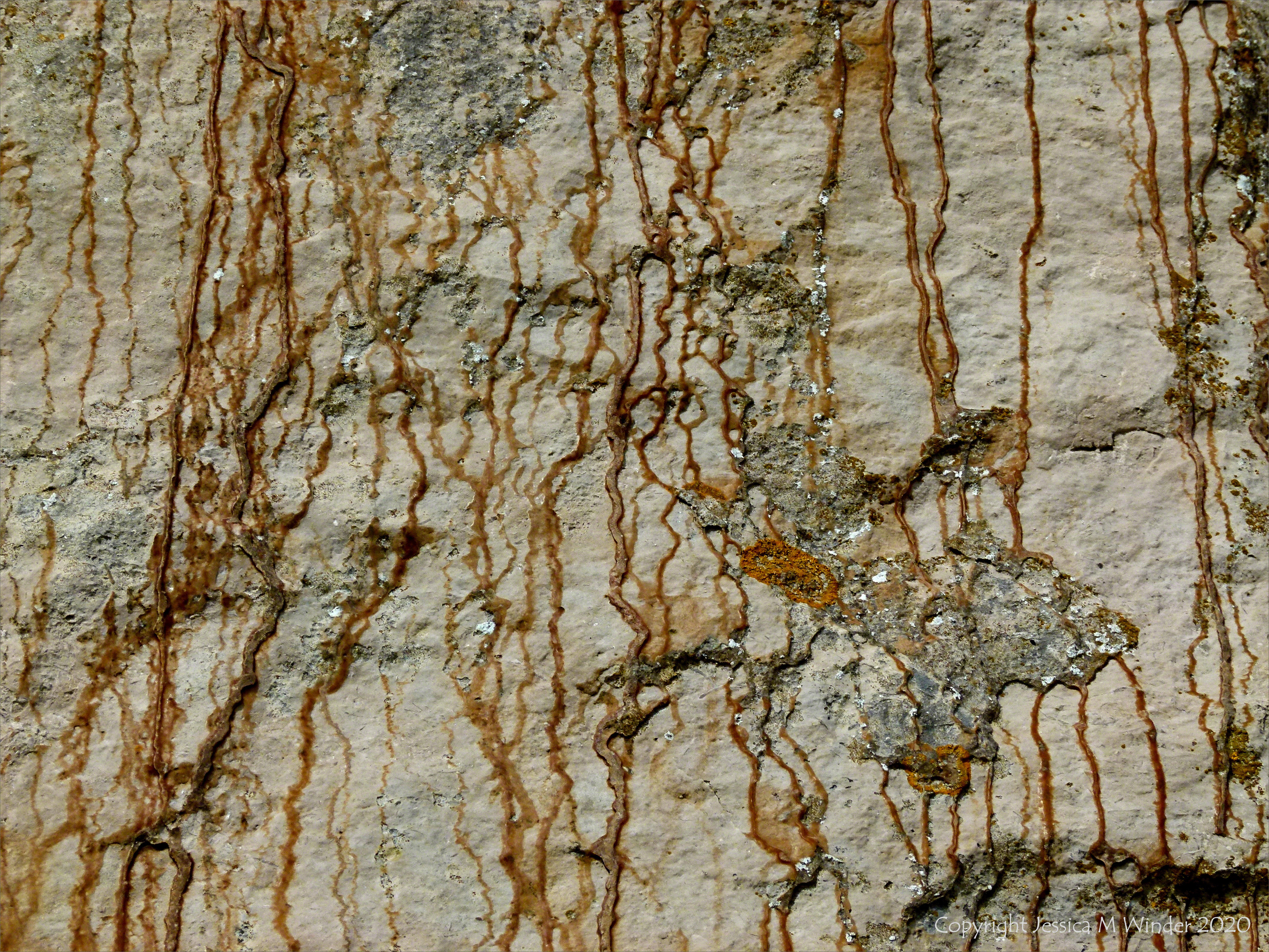 Rocks IOPJC 7 Iron-stained crystalline calcite deposited on the surface of quarried limestone rock, similar to travertine.