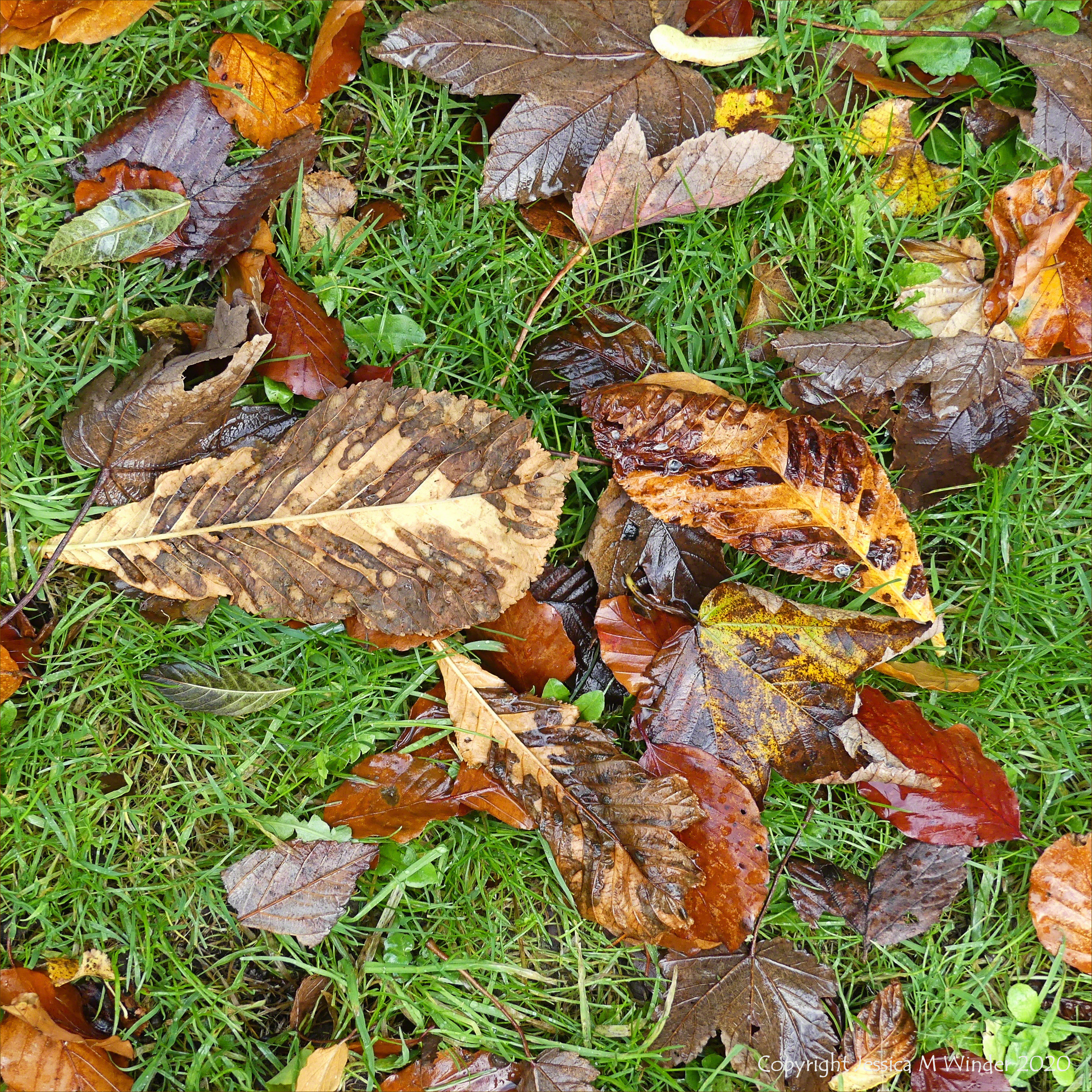Autumn leaves lying on the ground starting their decomposition journey of natural nutrient recycling. All photos of leaves in Entropy Series 8 taken during a few yards walk a short distance from my door in the village of Charlton Down in Dorset, England, 26 October 2020.