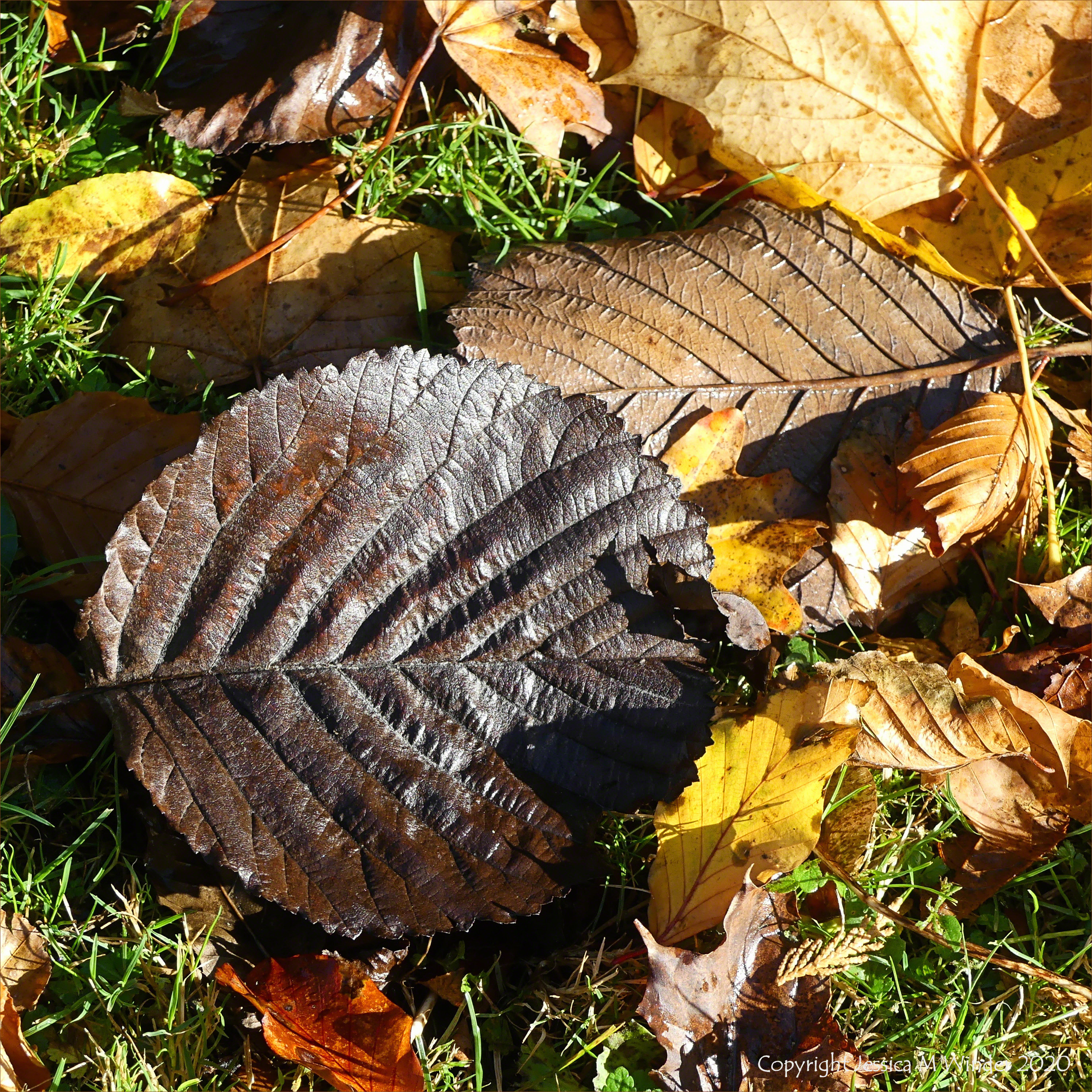 Autumn leaves lying on the ground starting their decomposition journey of natural nutrient recycling. All photos of leaves in Entropy Series 8 taken during a few yards walk a short distance from my door in the village of Charlton Down in Dorset, England, 26 October 2020.