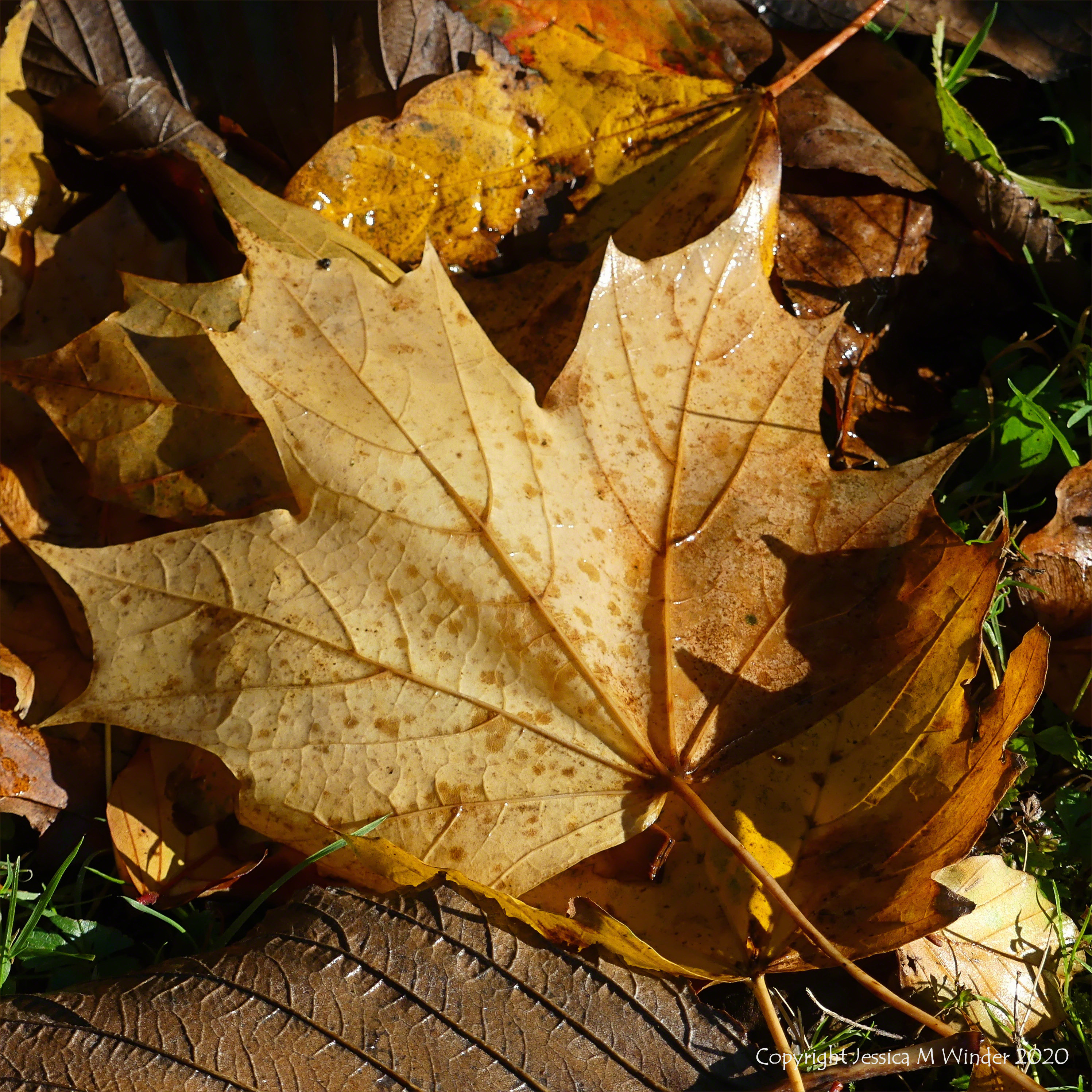 Autumn leaves lying on the ground starting their decomposition journey of natural nutrient recycling. All photos of leaves in Entropy Series 8 taken during a few yards walk a short distance from my door in the village of Charlton Down in Dorset, England, 26 October 2020.