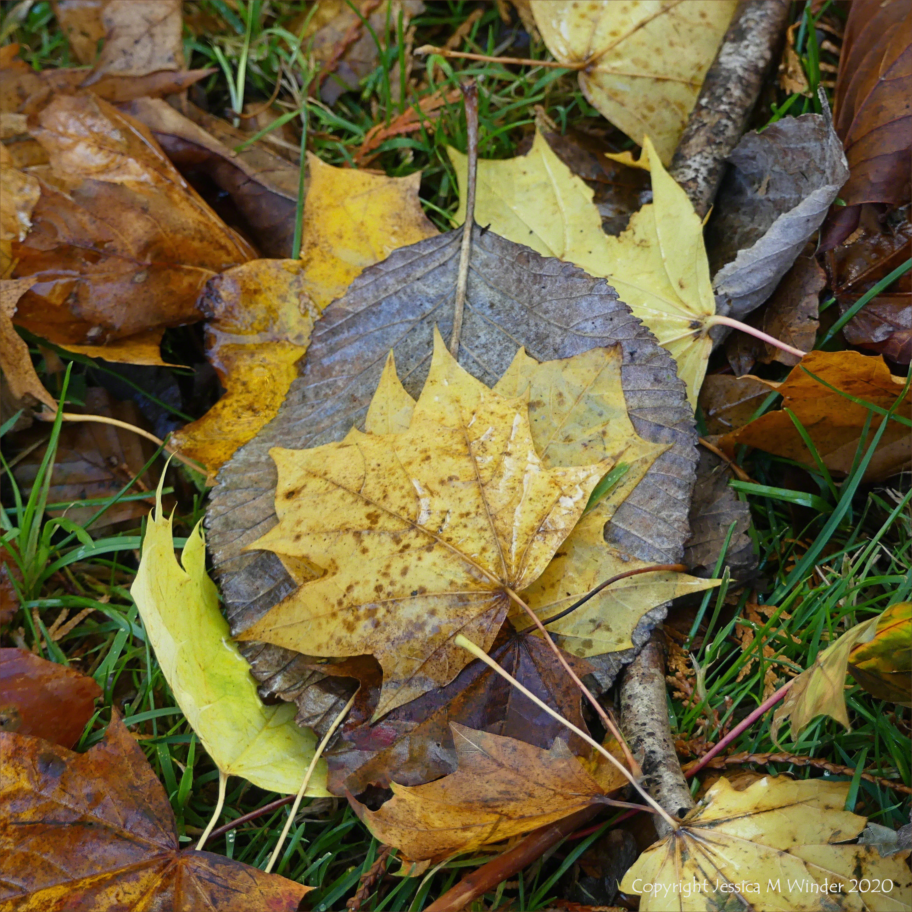 Autumn leaves lying on the ground starting their decomposition journey of natural nutrient recycling. All photos of leaves in Entropy Series 8 taken during a few yards walk a short distance from my door in the village of Charlton Down in Dorset, England, 26 October 2020.