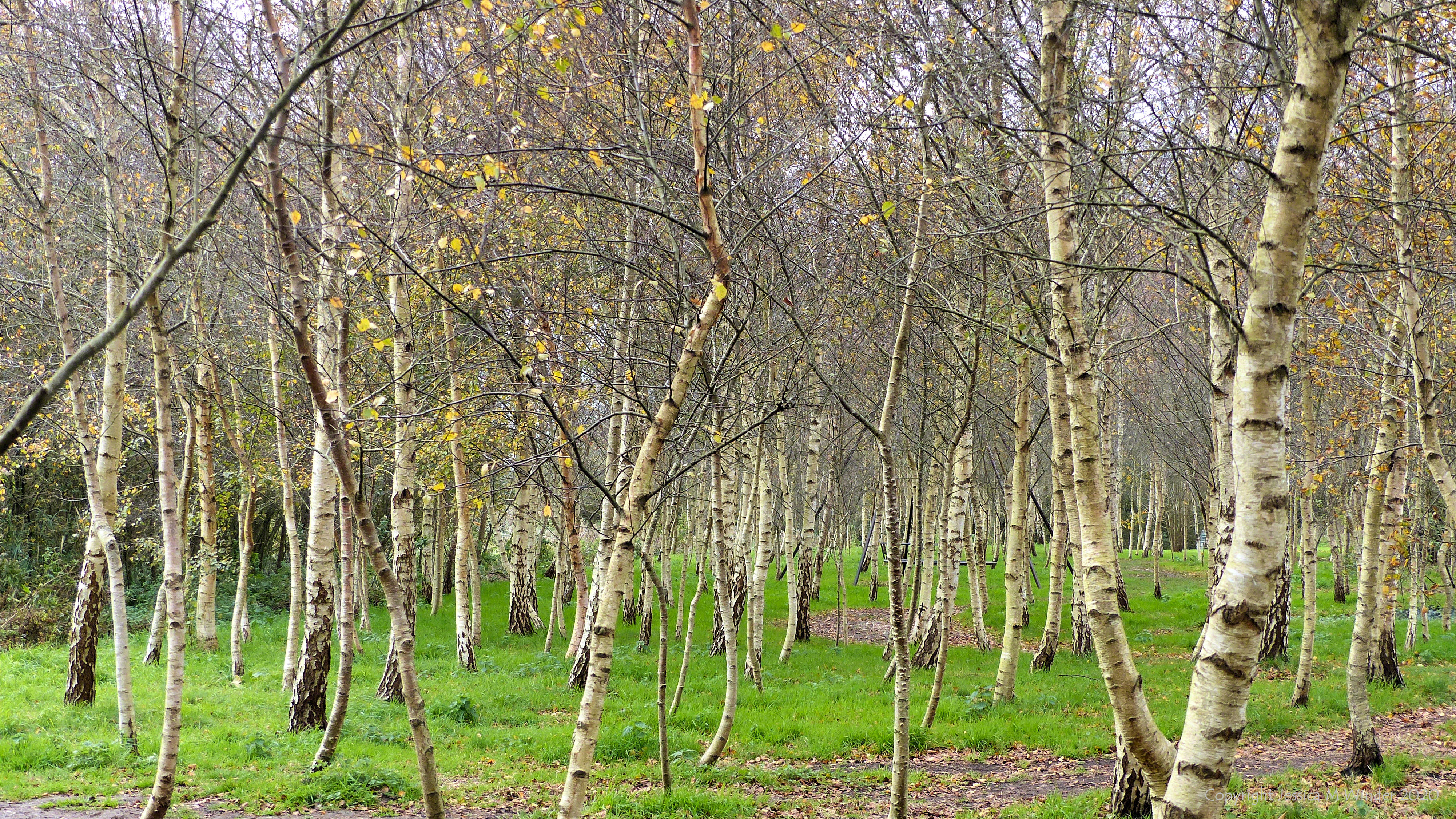 Birch trees at Sculpture by the Lakes in Dorset, England, 28th October 2020.
