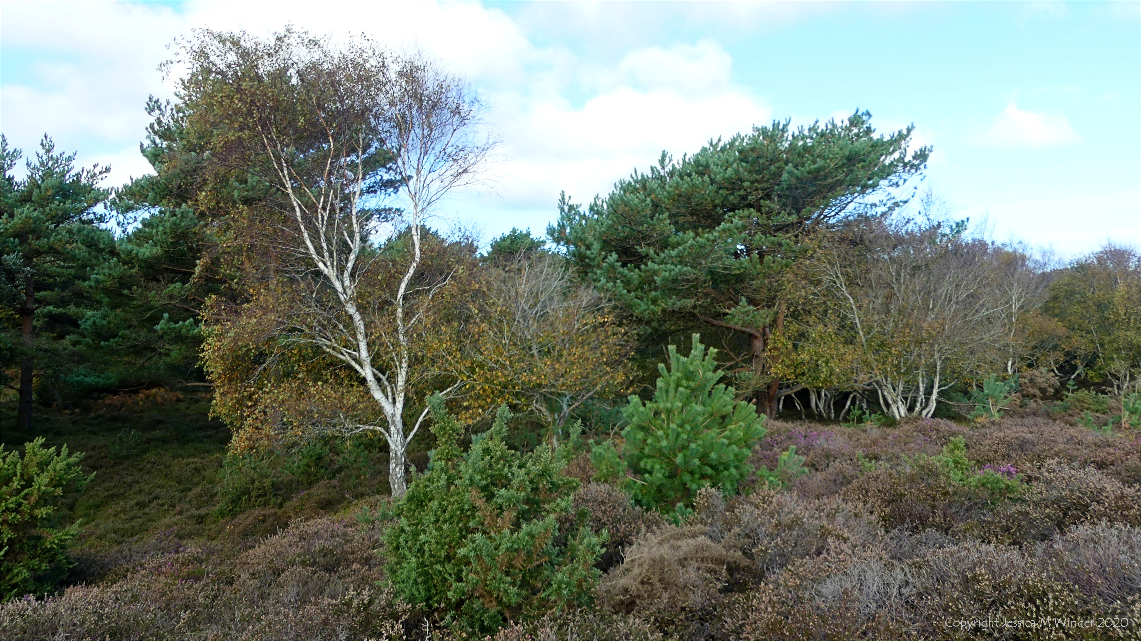 Heath SBJC 1 Details of plants and landscape of heathland habitat over sand dunes in Dorset at Studland, October 2020.