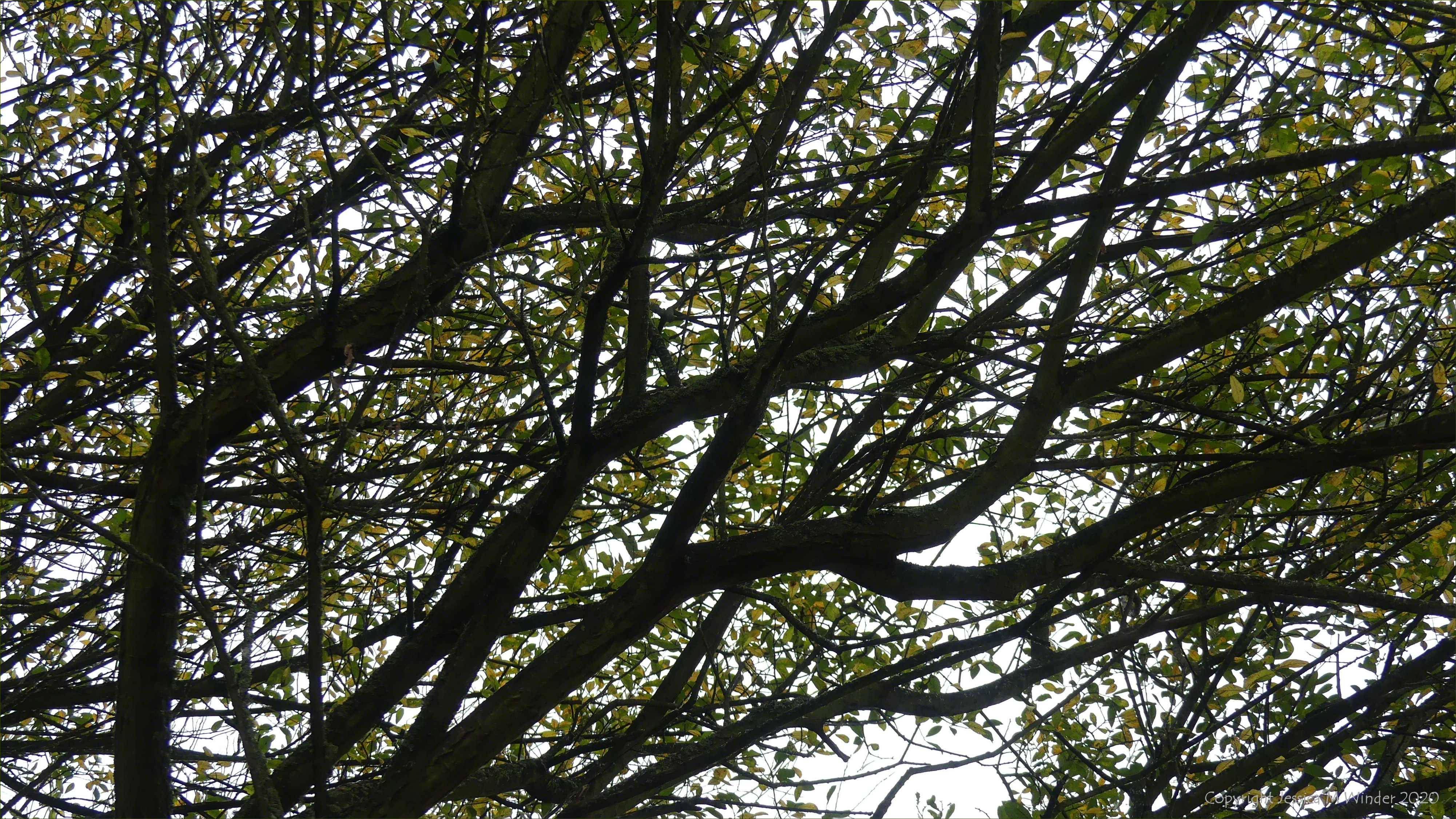 Looking up into a willow with leaves changing colour in autumn at Radipole Lake in Weymouth, Dorset, October 2020