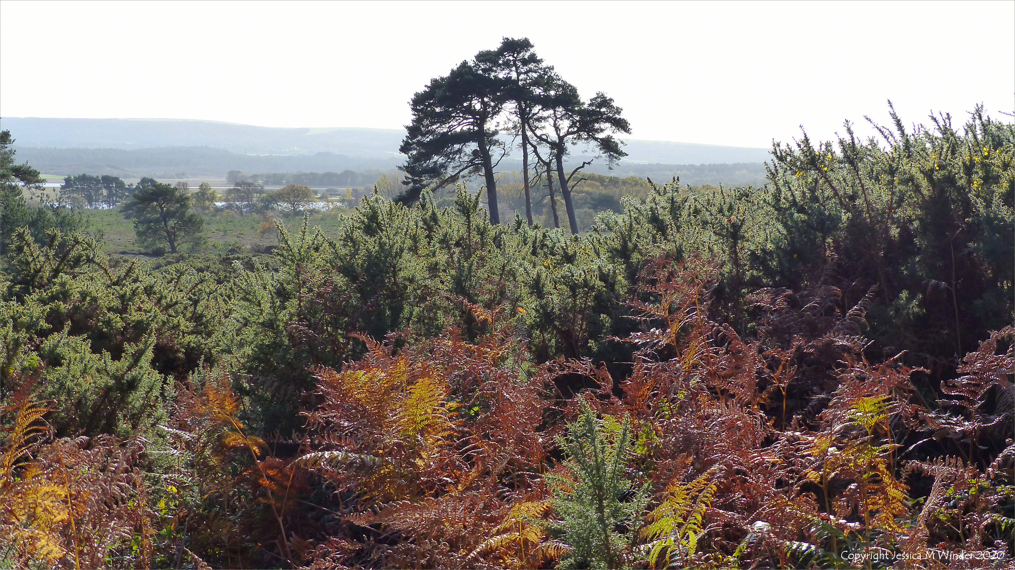 View across gorse, ferns, and pines towards the harbour’s edge from woodland at Arne RSPB reserve in Dorset, 3 November 2020.