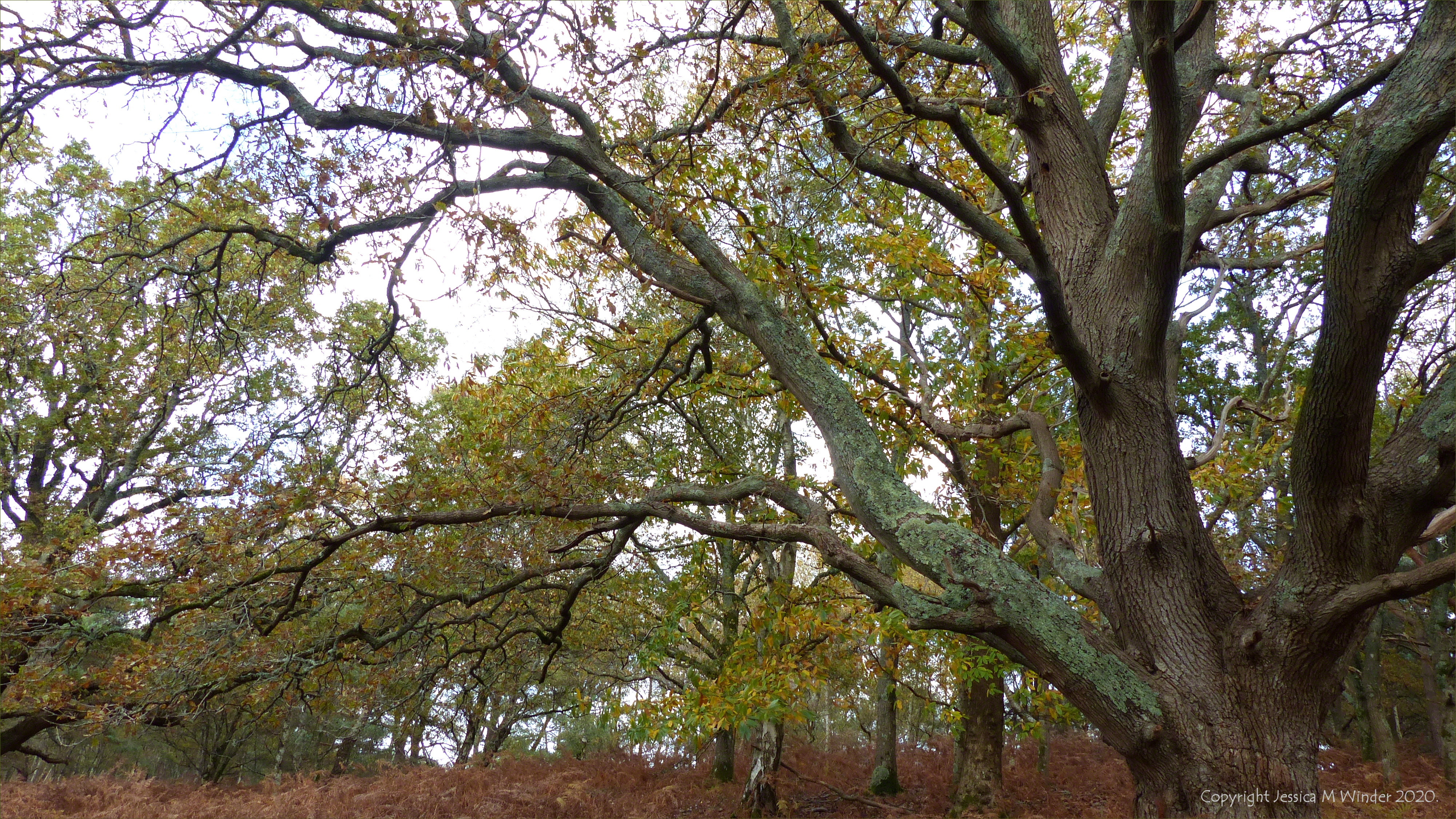 Arne Autumn 1.22 Oak and birch trees with a carpet of dry bracken in woodland at Arne RSPB reserve in Dorset, 3 November 2020.