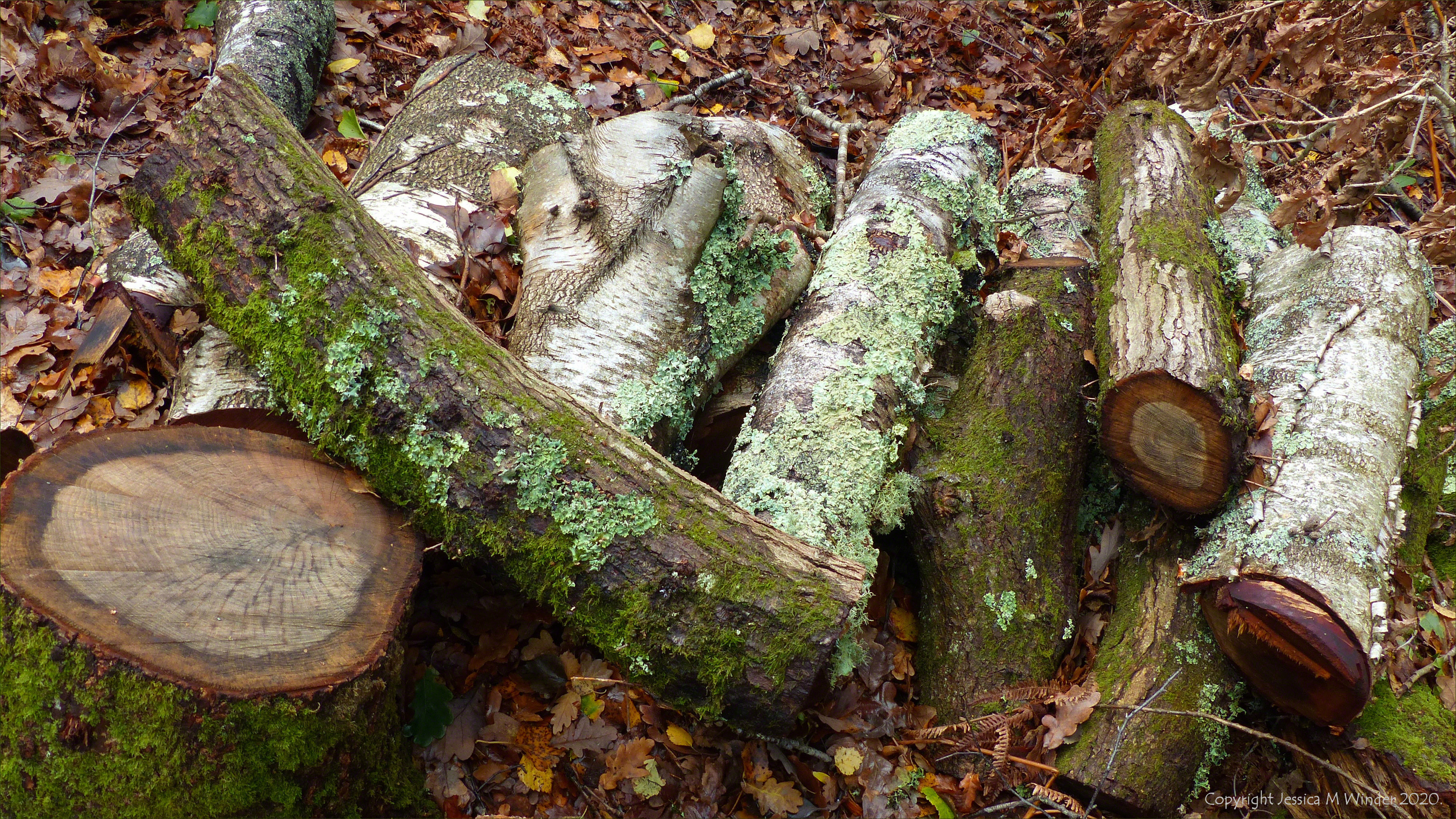 Arne Autumn 1.23 Pile of logs covered with lichen and moss in woodland at Arne RSPB reserve in Dorset, 3 November 2020.